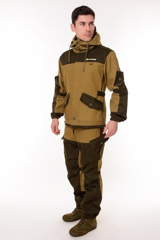 Костюм выполнен из 100% хлопковой ткани. Сложный анатомический крой делает его незаменимым для любителей активного отдыха. Куртка на пуговицах, с двухслойной супатной застежкой. Плечи усилены плотной непромокаемой тканью. Брюки с поясной резинкой и шлевками под ремень. Колени с усилением и дополнительным объемом.