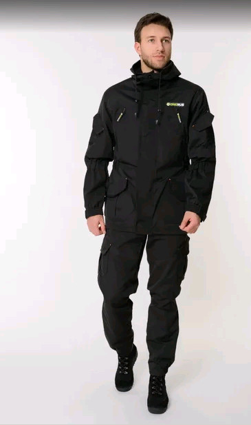 Костюм выполнен из смесовой ткани. Сложный анатомический крой делает его незаменимым для любителей активного отдыха. Куртка на пуговицах, с двухслойной супатной застежкой. Плечи усилены плотной непромокаемой тканью. Брюки с поясной резинкой и шлевками под ремень. Колени с усилением и дополнительным объемом.