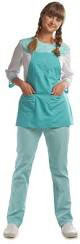 Необычный вариант для поваров - костюм тройка (блузон, фартук, брюки) Блузон приталенного силуэта, с круглым вырезом горловины и застежкой на кнопки на плечевом шве. Кокетка о манжеты на рукавах выполнены из ткани в тон брюк. Фартук контрастного цвета с застежкой на груди кнопками к блузону. Два накладных удобных кармана. Вышивка на груди в виде маленького повара. Брюки прямого силуэта, зауженные книзу, Удобный широкий пояс-резинка. Сидят точно по фигуре.