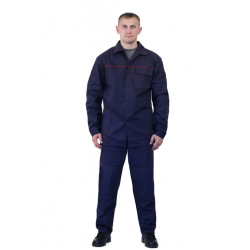 Костюм состоит из куртки и брюк, с усилительными накладками в области локтей и коленей. Куртка с центральной застежкой на пуговицы, с отложным воротником. На куртке один верхний с клапаном и два нижних накладных кармана, нижний край кокетки обработан красным кантом. Брюки на притачном поясе с передними накладными карманами.