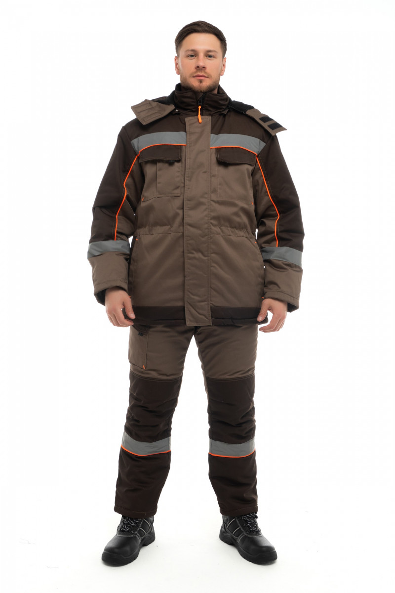 Застежка на тесьму-«молния», закрытую ветрозащитной планкой на липучках Трикотажные манжеты по низу рукавов Ветрозащитная прокладка под тканью верха С фигурной линией низа по спинке с правым накладным карманом с полуобъёмом и фигурным клапаном на липучку. Брюки с застежкой гульфика на молнию и съёмными бретелями с левым прорезным карманом в рамку, с горизонтальным входом. Пояс брюк на пуговицах со шлевками для ремня и фигурным клапаном на липучку с различными многофункциональными карманами нижними карманами в рельефных швах полочек. С объёмными наколенниками в области колен внутренним накладным карманом на подкладке на тесьму-«молния». В костюме используется световозвращающия лента 50мм с внутренней подпланкой, закрывающая контакт молнии с лицом и кант готовый оранжевого цвета. Съёмный капюшон с регулировкой объёма по лицевой и затылочной части и возможность использования капюшона на каску.