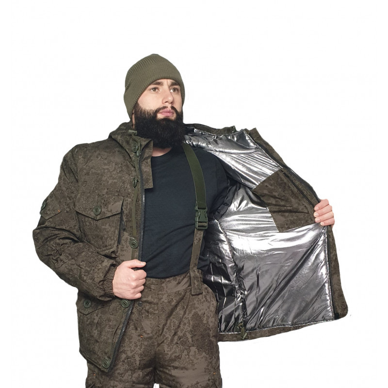 Дополнительным слоем утеплителя является ФЛИСОВЫЙ подклад (антипиллинговый флис), который сохраняет тепло и выводит излишки влаги.Отдельное внимание стоит уделить комбинезону костюма, который, благодаря флисовому расширителю, подойдёт даже к нестандартной фигуре. Комбинезон оснащён молнией с двойными замками. Внизу штанин также предусмотренны расширения на молнии для высоких сапог.Особенности: