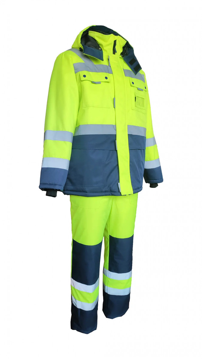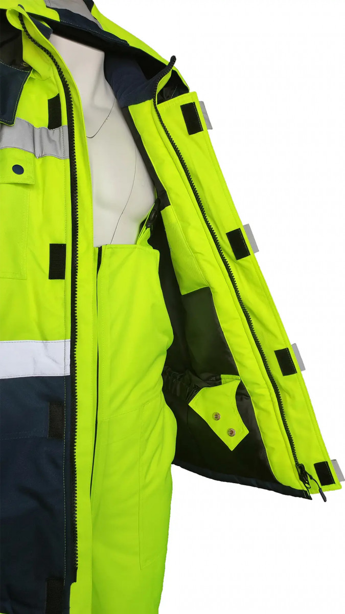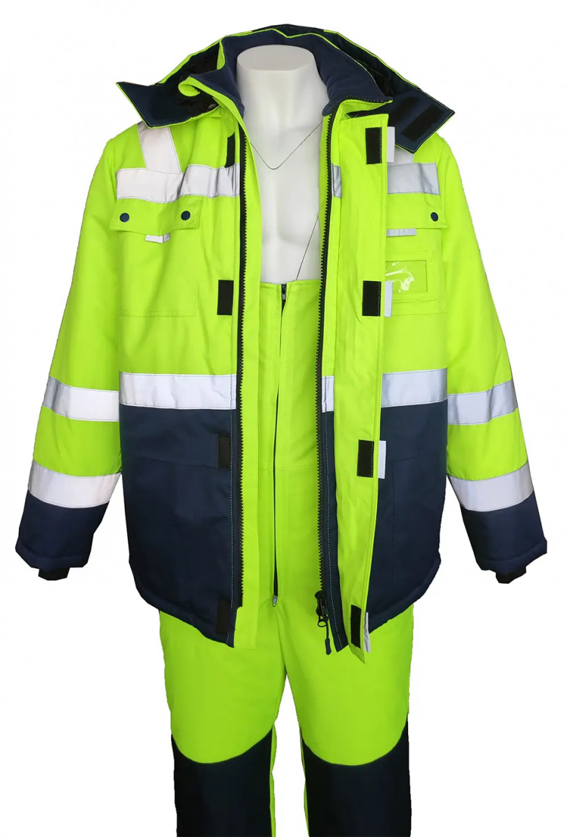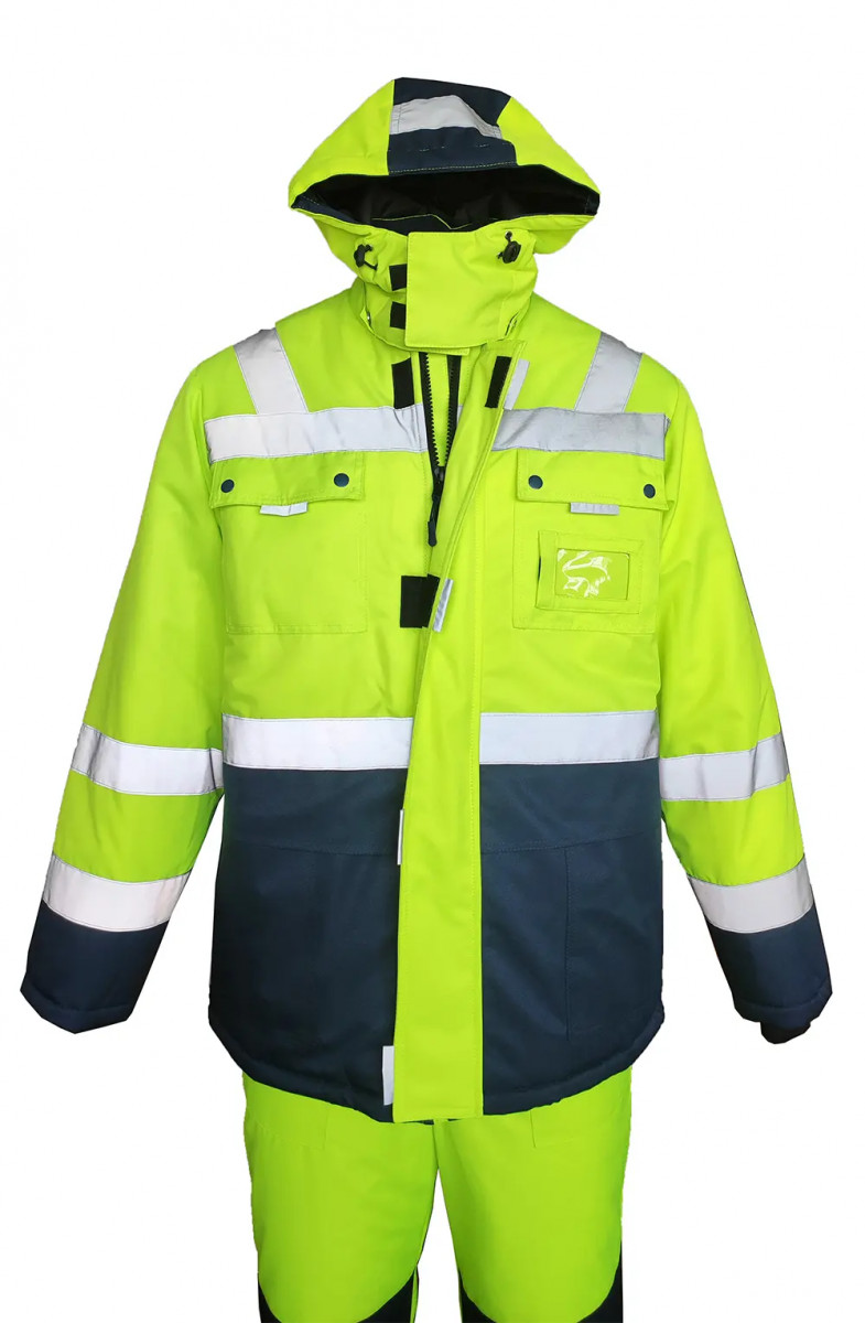 с центральной застежкой на молнию, закрытая ветрозащитной планкой на липучку с накладными карманами и клапанами на кнопках и карманом для бейджа нижними накладными карманами и внутренним карманом на подкладке с ветрозащитной юбкой на подкладке и утяжкой по низу куртки с воротником – стойка, внутренний воротник из тк. Флис съёмный капюшон с регулировкой объёма по лицевой части и возможность использования капюшона на каску трикотажные манжеты Ткань верха: «Nordika» полиэфир ТПУ мембрана, ВО пропитка состав: 100% ПЭ, пл. 170 г/м2±5г/м2 Ткань подкладочная: «Тафета 190», состав: 100% ПЭ, пл. 55 г/м2±10г/м2 Утеплитель: «Слайтекс»-120г/м2, в куртке 480 г/м2 (4слоя корпус, 3слоя рукав), в полукомбинезон 360 г/м2(3слоя) Рост, см: 170-176, 182-188 Размеры: с 88-92 по 120-124 Цвет: желтый (лимонный) с темно-синим ГОСТ: ГОСТ 12.4.303-2016, ГОСТ 12.4.281-2014