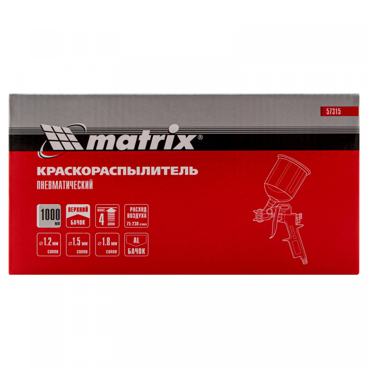 Пневматический краскораспылитель Matrix 57315 с верхним бачком объемом 1,0 л и соплами диаметром 1,2, 1,5 и 1,8 мм используется для окрашивания поверхностей и нанесения защитных составов. Он может работать с различными составами, такими как шпаклевка, лак и краска, т. к. в комплекте идет набор сменных сопел различного диаметра. Краскораспылитель пригодится в автосервисе или на стройке, а также на мебельном производстве для обработки дерева лаком.