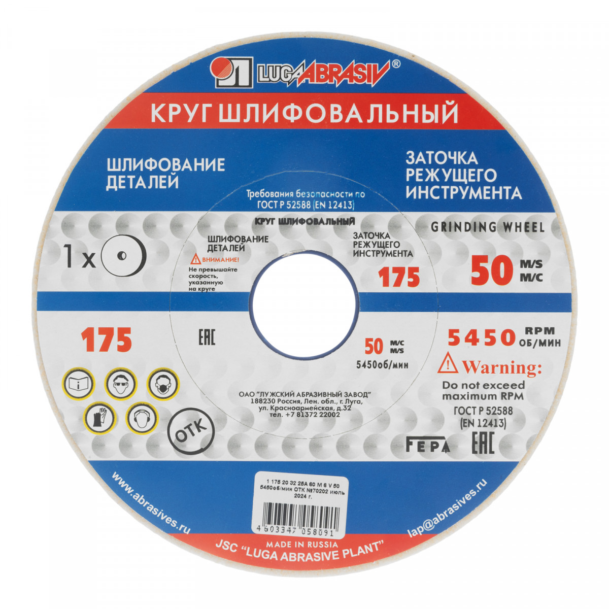 Шлифовальный круг Луга 73463 размером 175 х 20 х 32 мм, с абразивом 25A (белый электрокорунд), зернистостью F60 и твердостью M, N, устанавливается на точило с соответствующим посадочным диаметром и предназначен для шлифования закаленных деталей из углеродистых, нержавеющих и быстрорежущих сталей. Подходит также для заточки режущих кромок, обработки тонких деталей и инструментов — зубьев, ножей, сверл, резцов. Круг успешно справляется с твердыми материалами благодаря абразивным частицам из белого электрокорунда.