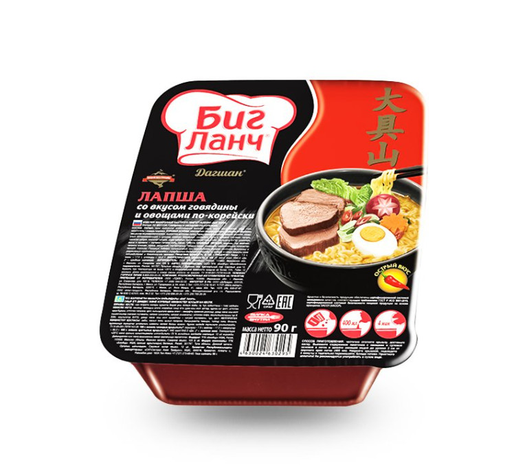 Лапша быстрого приготовления со вкусом говядины и овощами острая ПО-КОРЕЙСКИ Дагшан, от торговой марки "Биг ланч",позволить вам сытно, качественно , быстро утолить голод и получить удовольствие от еды.