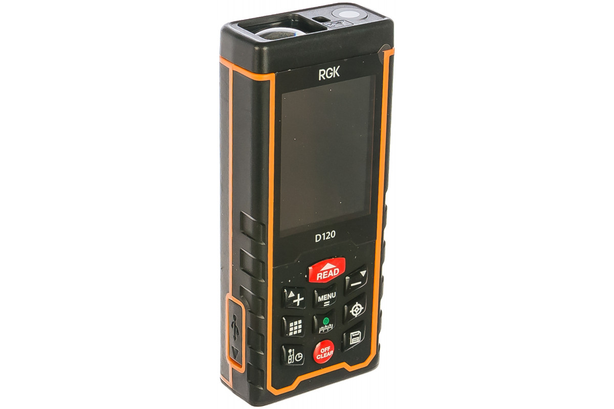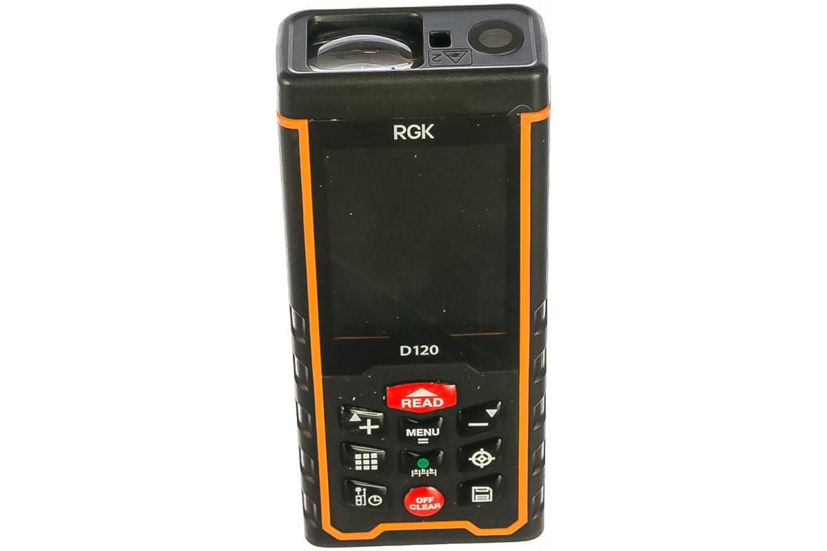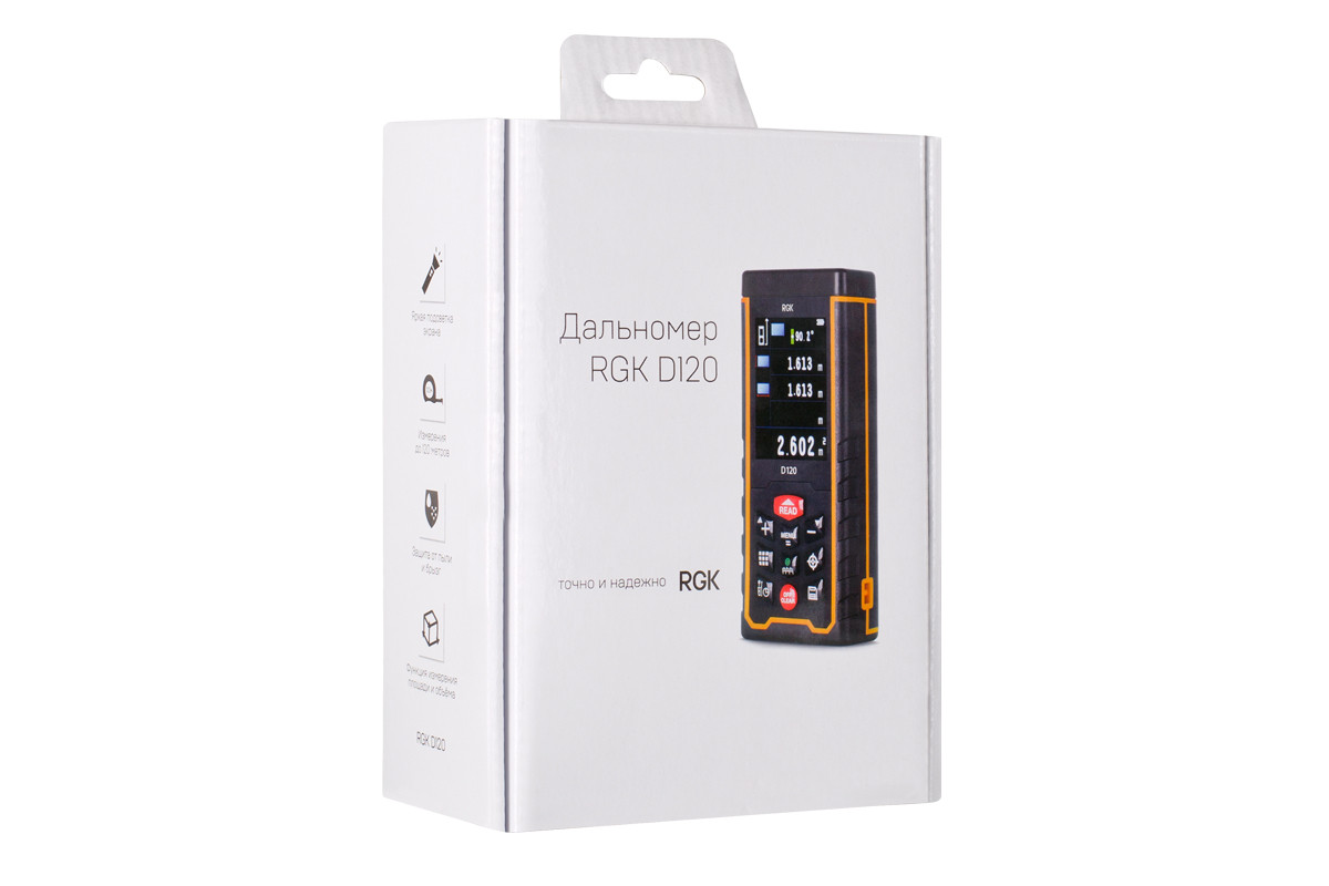 Лазерная рулетка RGK D120 предназначена для измерения расстояния в диапазоне от 0.3 до 120 метров в помещениях и на открытом пространстве. Она поддерживает следующие функции: вычисление площади и объема, расчет недосягаемых расстояний по теореме Пифагора, сложение и вычитание измерений, измерение заданного расстояния, измерение с задержкой, режим непрерывных измерений. Данная модель имеет возможность подключаться к ПК для анализа и передачи данных. При помощи встроенного цифрового уровня можно производить измерения в горизонт. Угол наклона - ±90°.