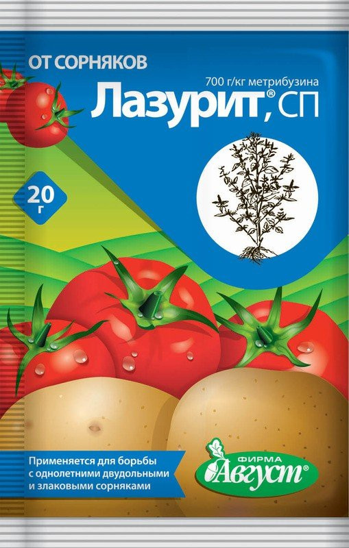 Лазурит является одним из наиболее эффективных и обеспечивает практически моментальное уничтожение сорняков при довсходовом применении и очень оперативное - при послевсходовом (10-20 суток). Лазурит, уничтожая сорняки на картофеле наповал, на сам урожай воздействия не оказывает, что позволяет применять его без риска для экологии. Кроме того, Лазурит обеспечивает активную защиту от последующих всходов сорняков на картофеле, благодаря чему урожайность при его использовании будет значительно выше.