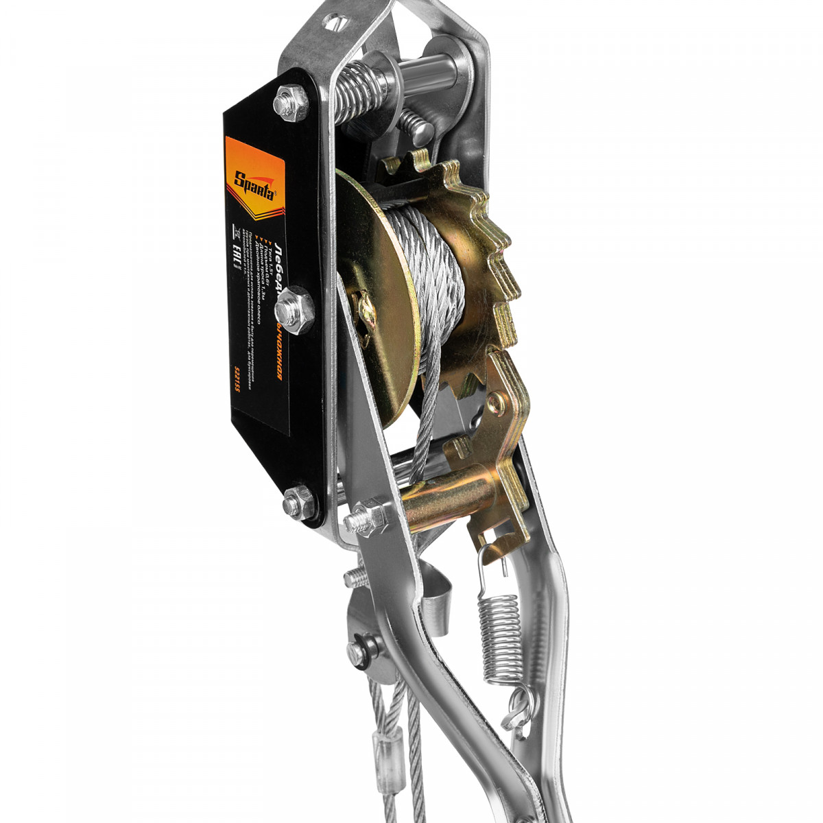 - Храповый тормоз обеспечивает безопасность груза, не допуская его падения.