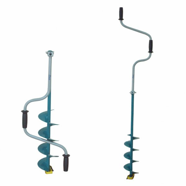Основное и единственное отличие двуручных ледобуров от классических – верхняя рукоятка ледобура смещена относительно оси ледобура на 130 мм, а нижняя на 150 мм. Такое расположение рукояток позволяет вращать ледобур одновременно двумя руками, тем самым, увеличивая скорость бурения лунок во льду. Кроме того, существенно уменьшаются габариты ледобура в транспортном положении. По всем остальным характеристикам двуручные ледобуры полностью соответствуют классическим. Выпуск ледорубов с диаметром бурения 150 мм имеет целью перекрыть пустующую нишу в промежутке между диаметрами 130 и 180 мм. В тех случаях, когда необходим увеличенный диаметр лунки, а применение ледобура на 180 еще нецелесообразно, незаменимым инструментом рыболова станет "стопятидесятый". Межцентровое расстояние креплений ножей увеличено для их большей жесткости.