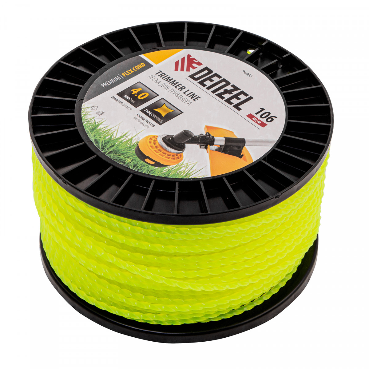 Леска для триммера Denzel FLEX CORD 96803 с сечением «витой квадрат», толщиной 4,0 мм и длиной 106 м, на DIN-катушке, предназначена для скашивания крупностеблевой растительности, сорняков, борщевика. Используется на бензиновых триммерах с объемом двигателя более 52 см3.