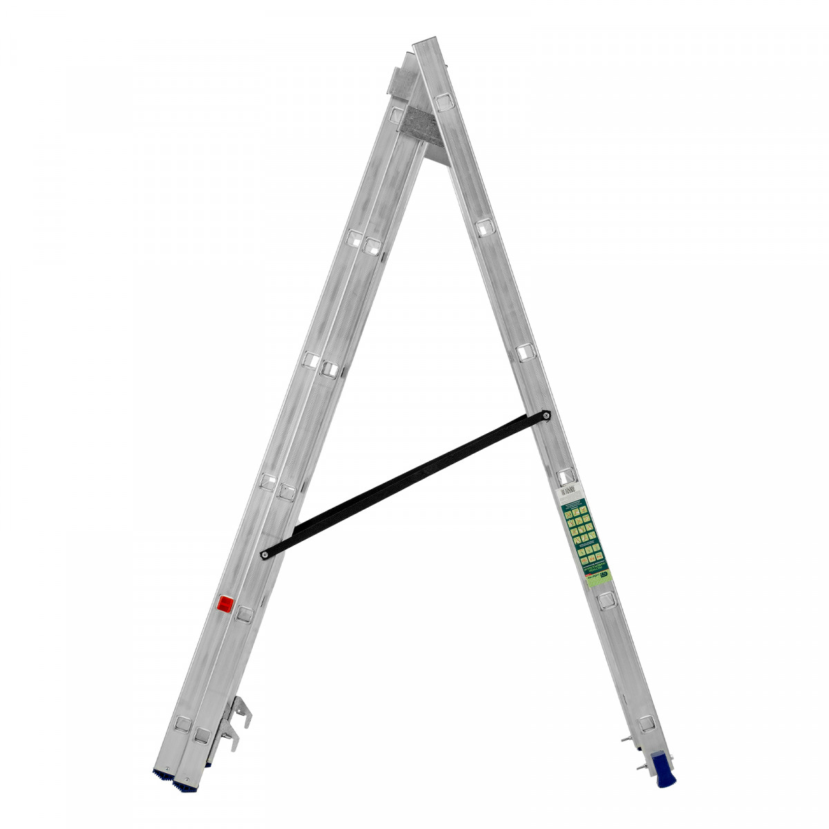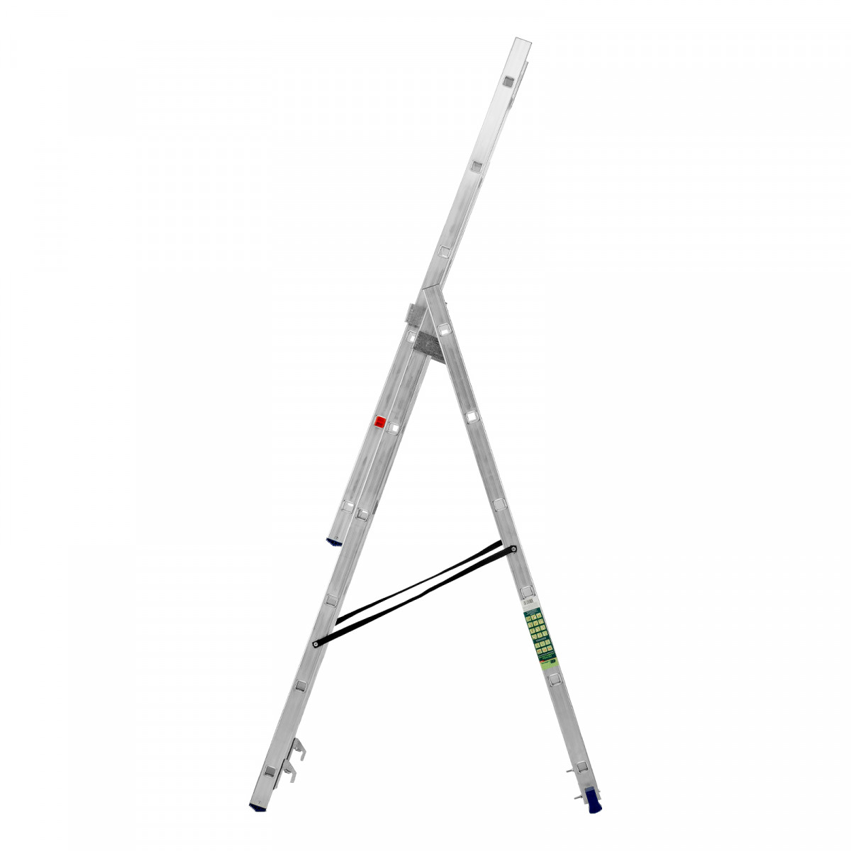 • Многофункциональность — лестница может использоваться в 3 различных вариациях — в качестве стремянки (с двумя расставленными и одной выдвинутой вверх секцией), двухсторонней стремянки (две секции расставлены, третья демонтирована) и приставной лестницы.