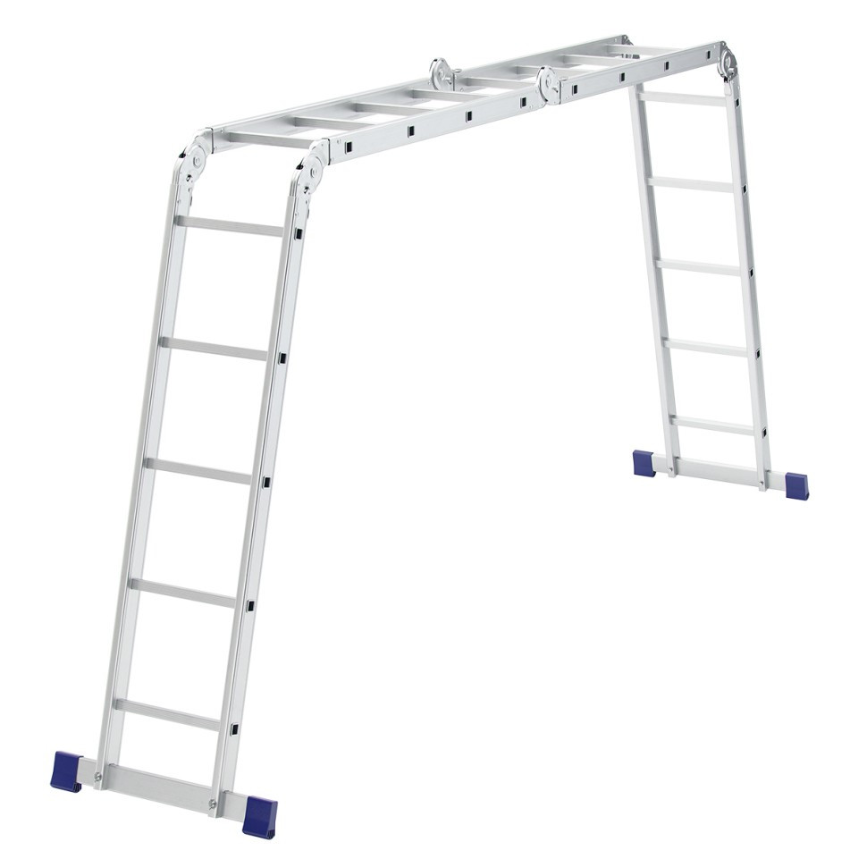 Шарнирная алюминиевая лестница Сибртех 97884 представляет собой 2 секции по 4 ступени и 2 секции по 5 ступеней, которые можно настроить в нескольких рабочих положениях. Она может использоваться в качестве приставной лестницы, двухсторонней стремянки и помоста. Будет полезна как в быту, так и на небольших стройках, в гараже и магазинах.