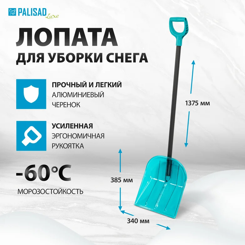 Лопата Palisad LUXE 61691 длиной 1340 мм, с ковшом из поликарбоната размером 340 х 385 мм и алюминиевым черенком, позволяет очистить от снега дорожки на загородном участке, тротуар, выезд из гаража и т.д. Вместительный ковш с увеличенными бортами позволяет убирать снег различной глубины. Благодаря заостренной кромке ковша лопата справляется даже с плотным снегом и наледью.