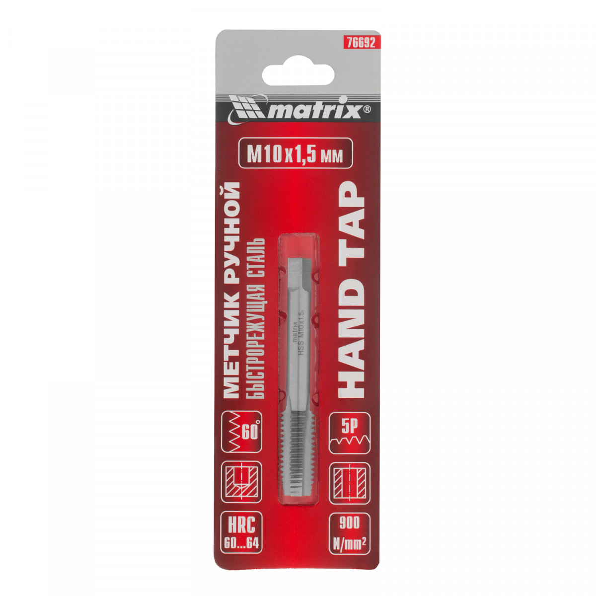 Ручной метчик Matrix 76692, HSS, — резьбонарезной инструмент, который используется для создания резьбы диаметром М10 и шагом 1,5 мм. Оптимален для работы с деталями из твердой стали прочностью до 900 Н/мм². Нарезает резьбу за один проход. Метчик устанавливается на метчикодержатель с патроном под хвостовик 5,4 мм. Будет полезен в слесарной мастерской, а также дома или в гараже.