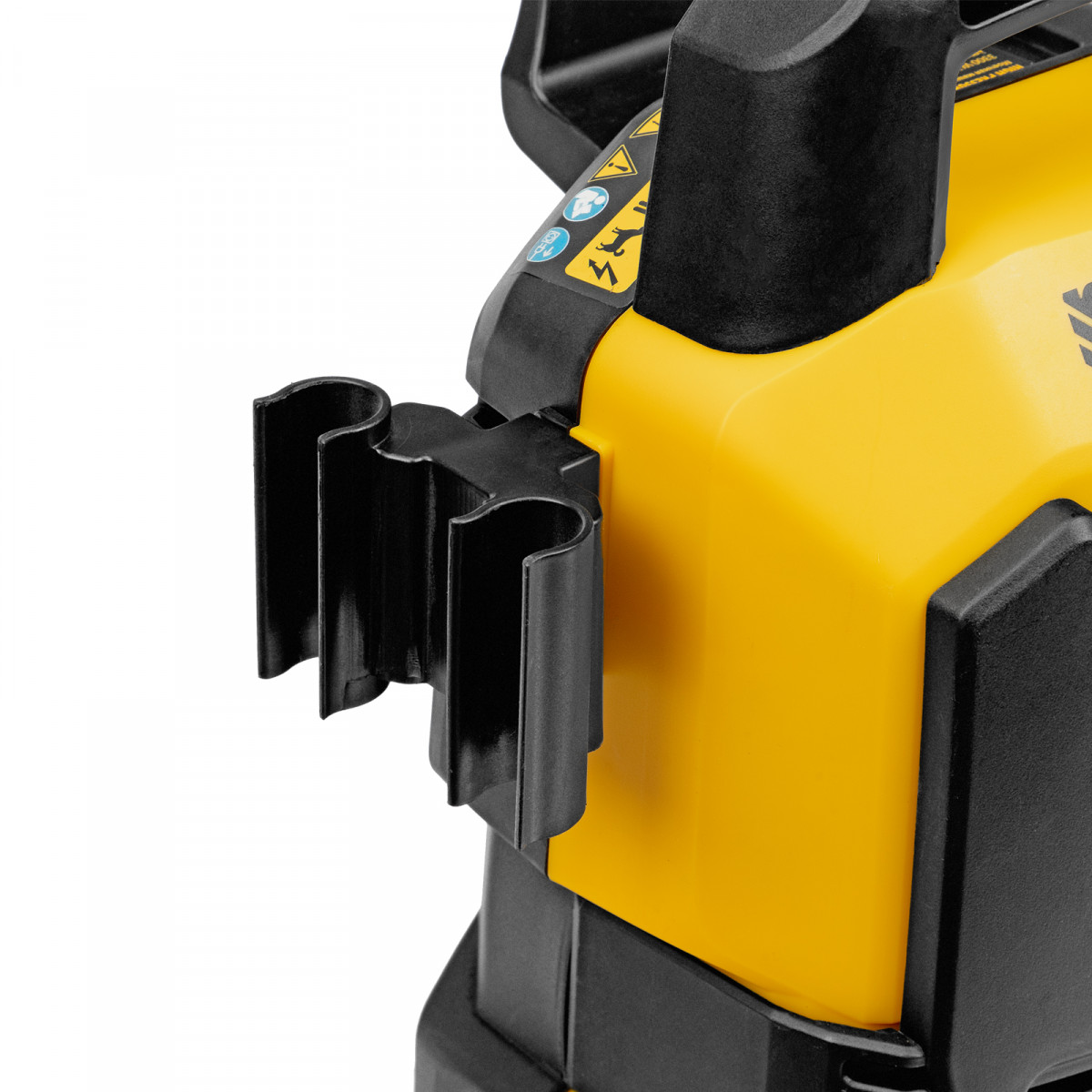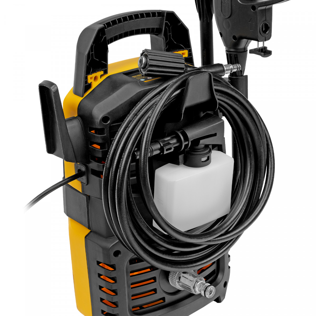 • Продуманная конструкция — кронштейны для шнура питания и шланга высокого давления, а также держатель для пистолета обеспечивают удобство хранения.