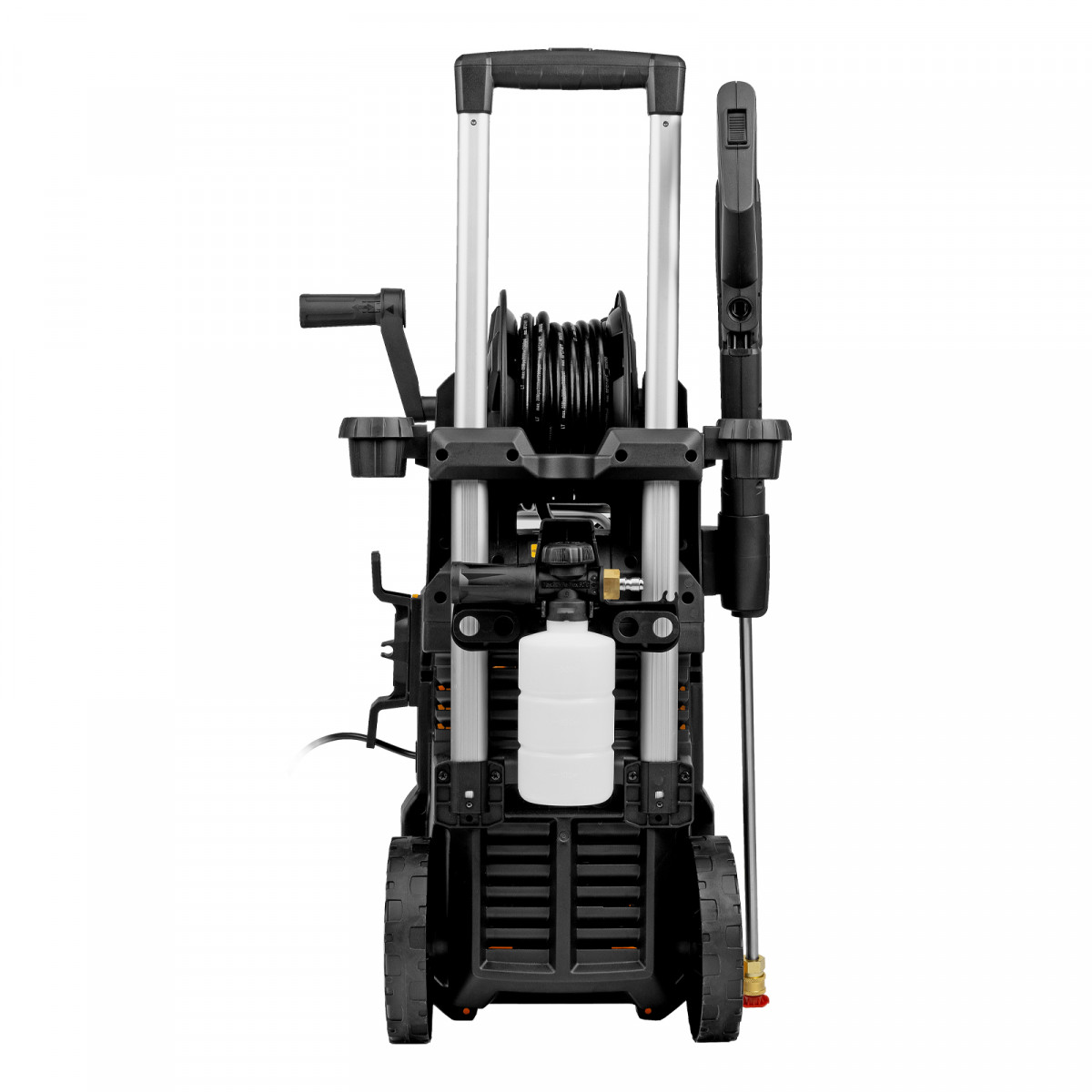 Мойка высокого давления, Барабан для шланга (установлен), Шланг высокого давления (установлен), Пистолет, Удлинитель пистолета, Сменные сопла 3 шт, Пеногенератор с бачком для моющего средства, Входной штуцер с фильтром, Быстросъемный коннектор шланга, кронштейн-держатель пистолета, Кронштей сетевого кабеля, Игла для прочистки сопла, Комплект крепежа, Инструкция с гарантийным талоном