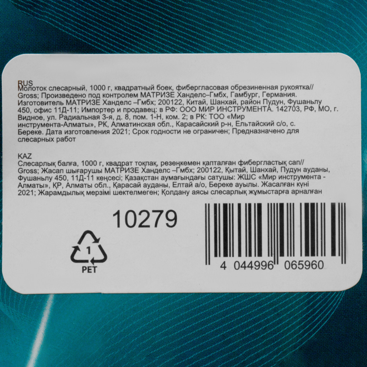 Молоток слесарный, 1000 г, квадратный боек, фибергласовая обрезиненная рукоятка Gross