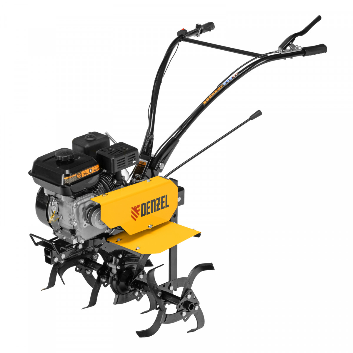 Мотоблок Denzel DPT-170 56431 с двигателем объемом 212 см3 и мощностью 7 л.с., ременным сцеплением, шкивом отбора мощности (ШОМ) и коробкой передач 2В/1Н используется для проведения различных сельскохозяйственных работ.