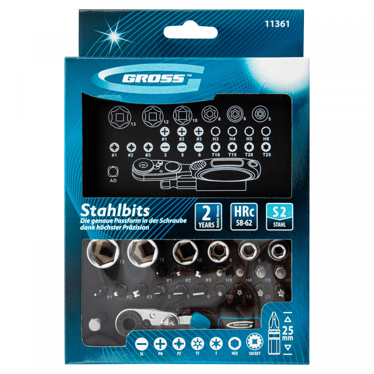 • Высокий ресурс — биты из японской легированной стали S2 твердостью 52-54 HRC и торцевые головки из хромованадиевой стали твердостью 48 HRC обладают повышенной прочностью, износостойкостью и рассчитаны на долгую службу.