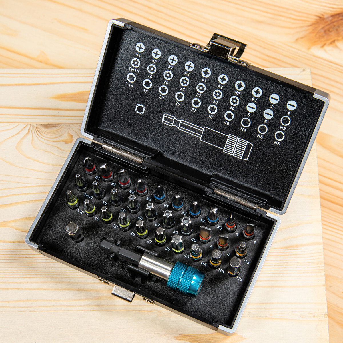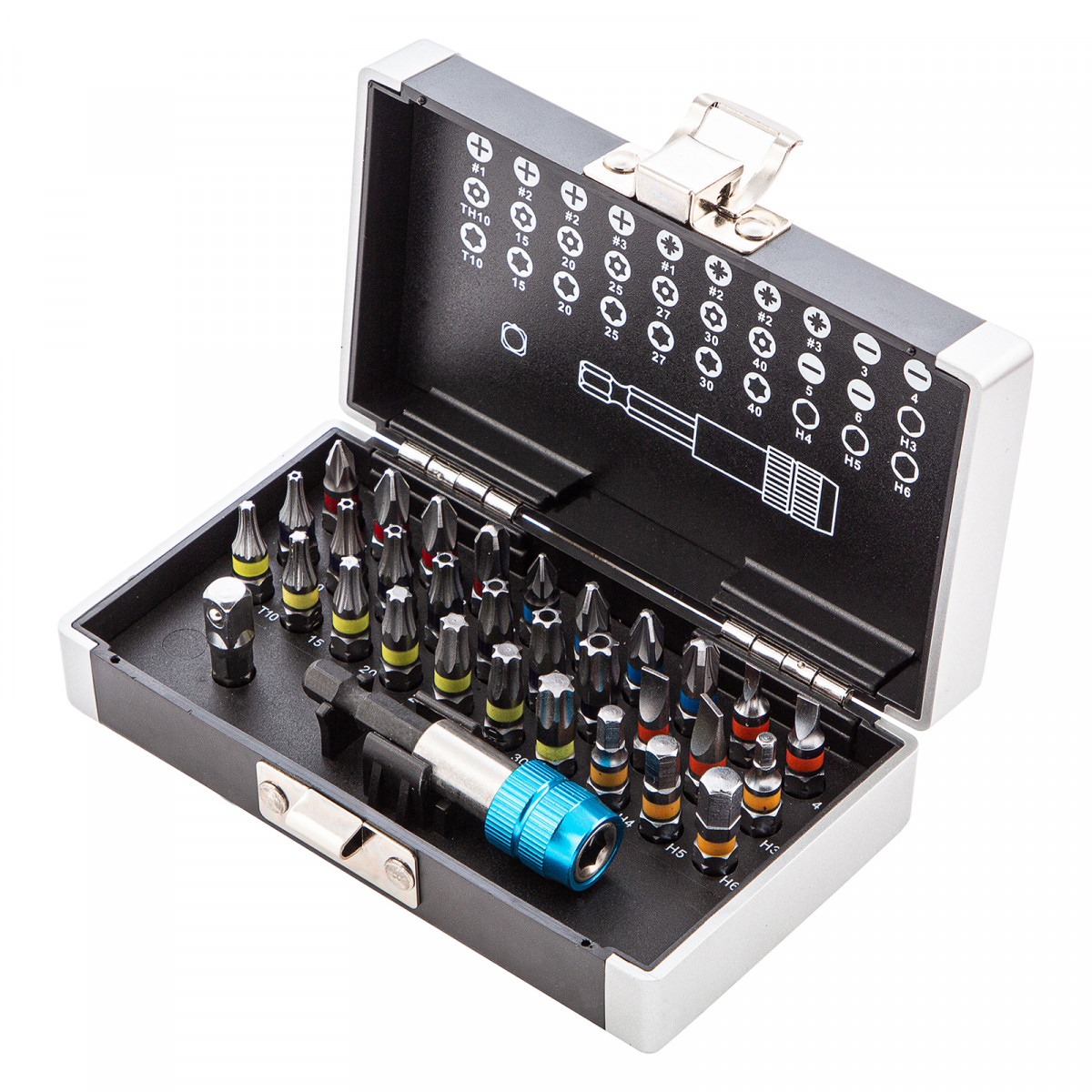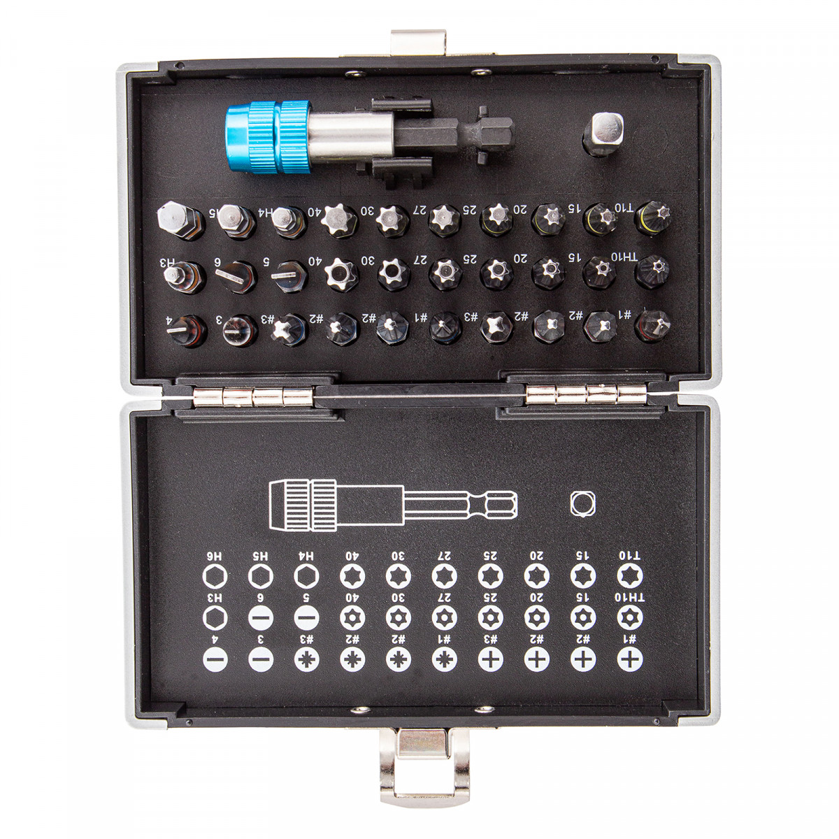 - Широкая комплектация — в одном наборе представлено 6 типов бит: PH и PZ калибров 1-3, SL калибров 3, 4, 5, 6, TORX и TORX Tamper (10, 15, 20, 25, 27, 30, 40), HEX 3-6