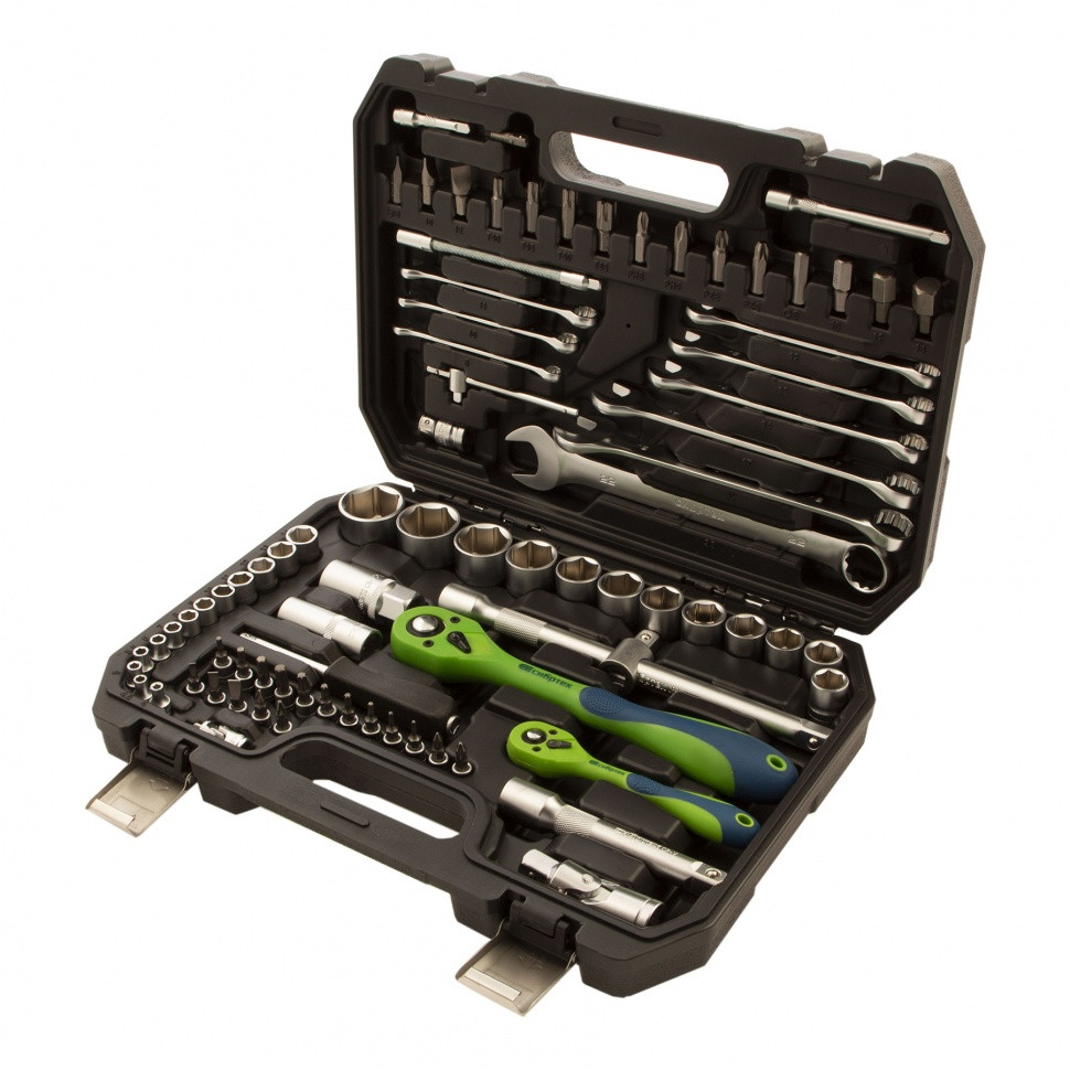 Разработан специально для автолюбителей, предназначен для ремонта машины в гараже. Может использоваться для выполнения несложных бытовых работ. Элементы набора изготовлены из CrV стали, обеспечивающей исключительную прочность, и имеют антикоррозийное матовое покрытие. Трещоточный ключ оснащен специальным переключателем с насечкой, что позволяет удобно работать одной рукой. Набор упакован в кейс, изготовленный из прочного противоударного пластика. Надежные металлические замки.