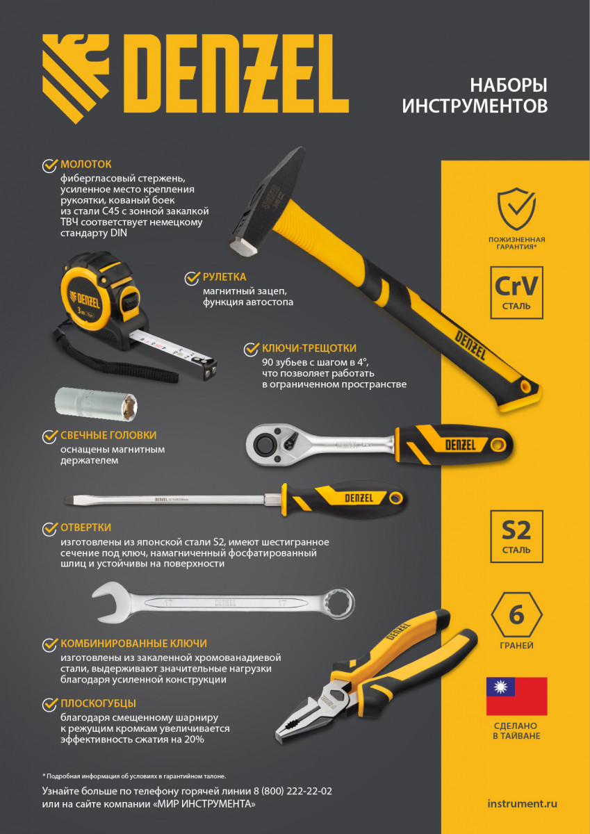 • Устойчивость к высоким нагрузкам — инструменты изготовлены из высокопрочной закаленной стали CrV, биты и отвертки выполнены из японской стали S2.