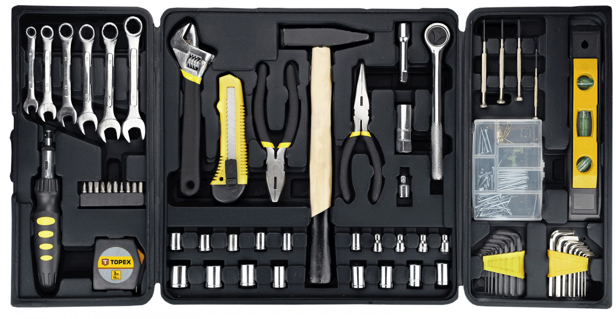 Набор инструмента TOPEX состоит из 135 предметов, упакованных в пластмассовый чемоданчик. Весь инструмент отличается высоким качеством исполнения. В набор входит следующий стандартный инструмент: молоток весом 300 г, нож с отламывающимся лезвием, стальная рулетка, строительный уровень, разводной ключ, комбинированные ключи, сменные головки либо наконечники. Практичным решением является наличие в чемоданчике органайзера для гвоздей, винтов и т.п. Набор предназначен для универсального применения, для мелких монтажных работ, ремонта оборудования и автомобилей, а также прочих работ в быту и в гараже каждого домашнего мастера.