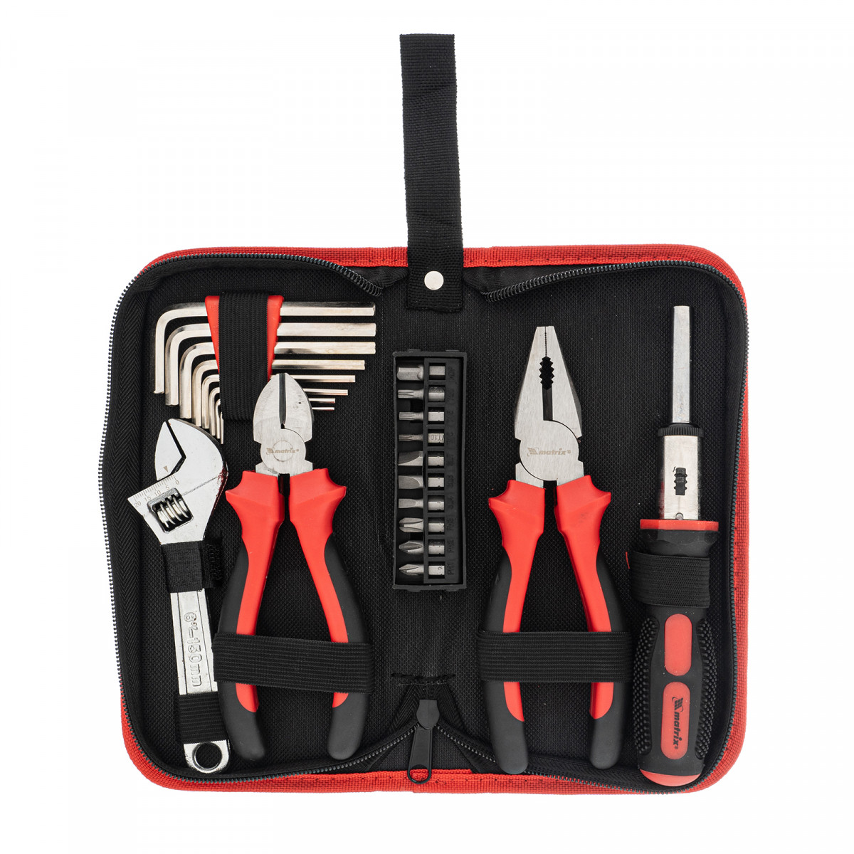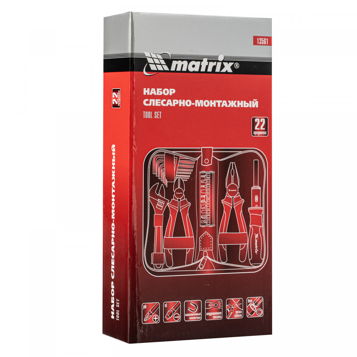 Слесарно-монтажный набор Matrix 13561, 22 предмета, оптимально подходит для бытового и профессионального использования. Универсальный набор содержит ключи-шестигранники для удобства работы в труднодоступных местах, разводной ключ для монтажа/демонтажа болтов и гаек, реверсивную отвертку с битами и переходником для работы с крепежными элементами, бокорезы и плоскогубцы для зажима и сгибания заготовок.
