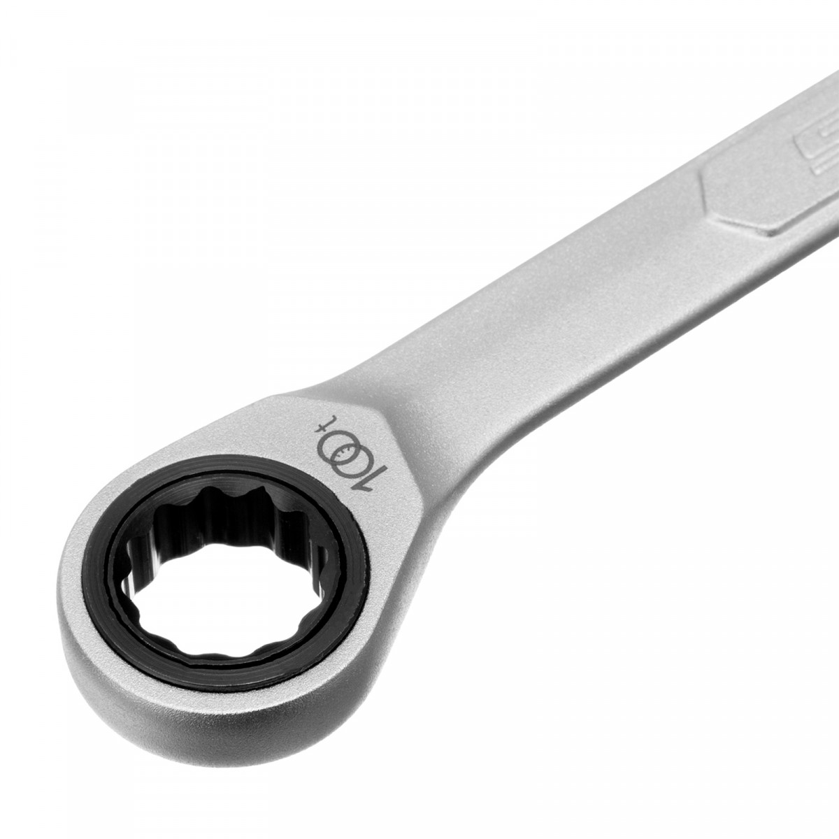 Набор комбинированных трещоточных ключей Gross 14858 включает 5 инструментов из стали CrV и используется при монтаже и демонтаже резьбовых соединений диаметром от 8 до 17 мм. Каждый ключ имеет как рожковую, так и накидную часть, что повышает его функциональность. У накидной части 12 внутренних граней, что увеличивает площадь соприкосновения с головкой крепежа и снижает риск ее деформации. Усиленная рожковая часть каждого ключа позволяет справляться с заржавевшим и крепко затянутым крепежом. Ключи применяются как в автосервисах, так и для самостоятельного ремонта автомобилей.