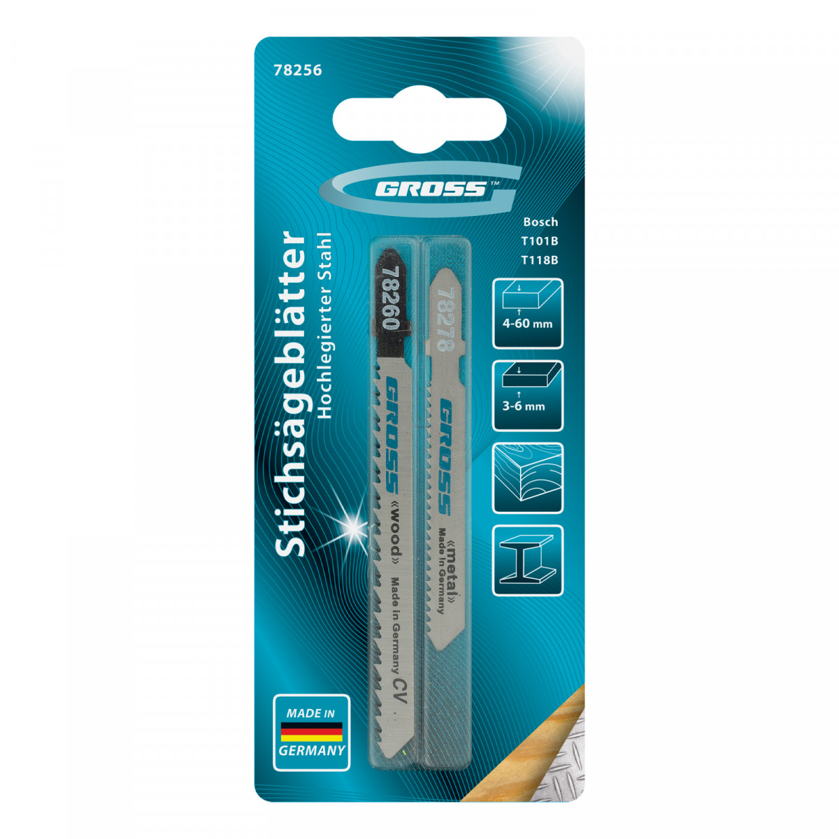 Универсальный набор полотен Gross 78256, 2 шт. в упаковке, предназначен для установки на электролобзики. Позволяет производить распил металлов толщиной 3-6 мм, а также древесины толщиной 4-60 мм. Благодаря отшлифованной под конус боковой поверхности полотна оставляют аккуратную кромку в месте распила.