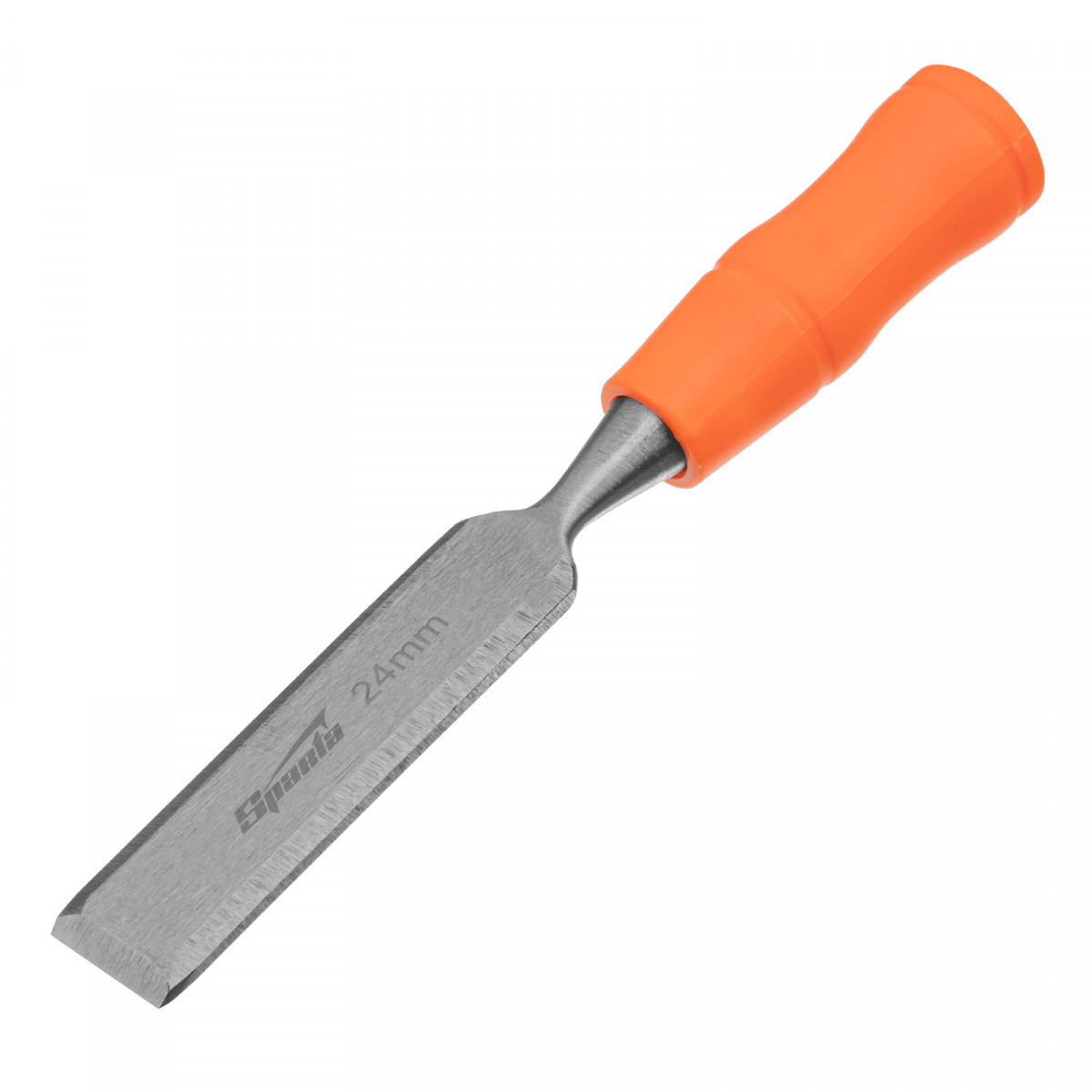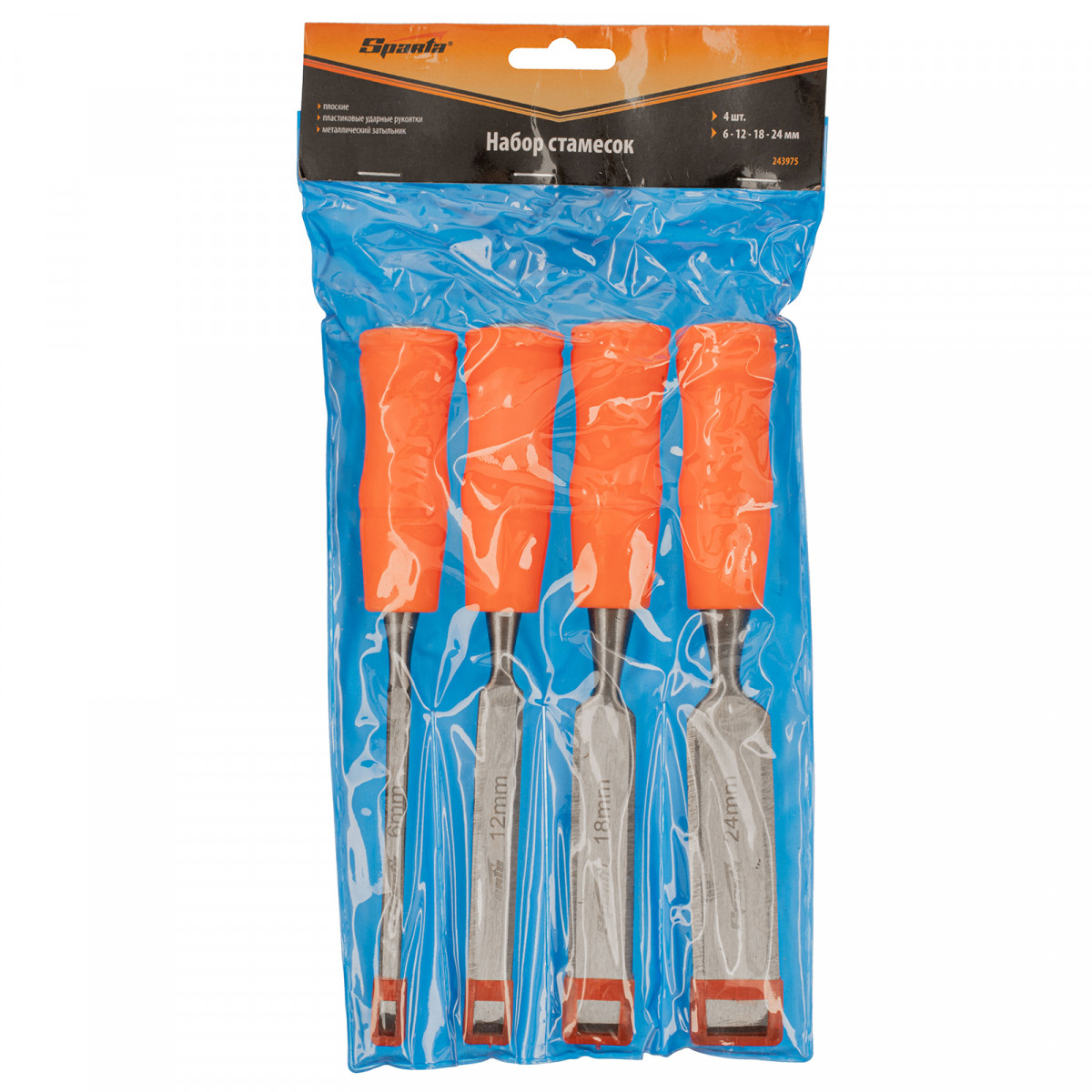 Набор Sparta 243975 из 4 плоских стамесок с пластиковыми ударными рукоятками, с полотнами шириной 6, 12, 18 и 24 мм, используется для работы по дереву — выборки пазов и углублений различной ширины, снятия фасок, зачистки поверхностей. Стамески выдерживают удары киянкой или молотком, т. к. металлический затыльник предотвращает деформацию рукоятки. Набор подойдет столяру, плотнику, мебельщику, а также домашнему мастеру.