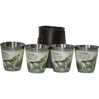 Стопки изготовлены из нержавеющей стали и обрамлены искусственной кожей. Стопки хранятся в кожаном кофре.