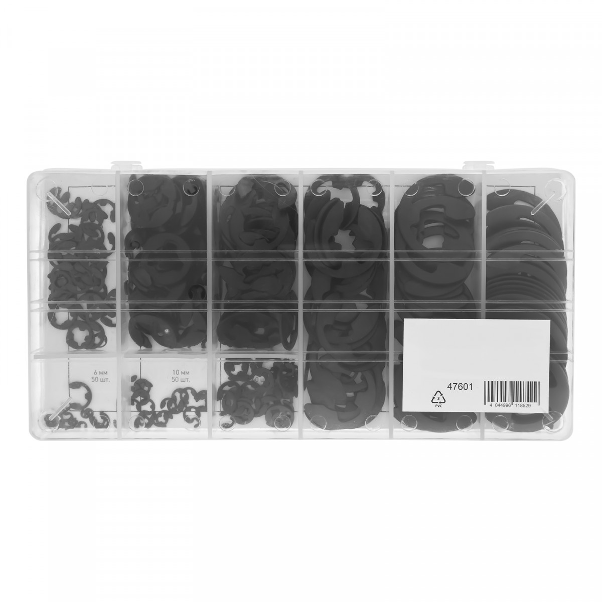 Пластиковый кейс- 1 штСтопорные кольца: 1,5 мм - 30 шт3 мм - 30 шт5 мм - 40 шт6 мм - 50 шт10 мм - 50 шт12 мм - 40 шт15 мм - 20 шт19 мм - 20 шт22 мм - 20 шт
