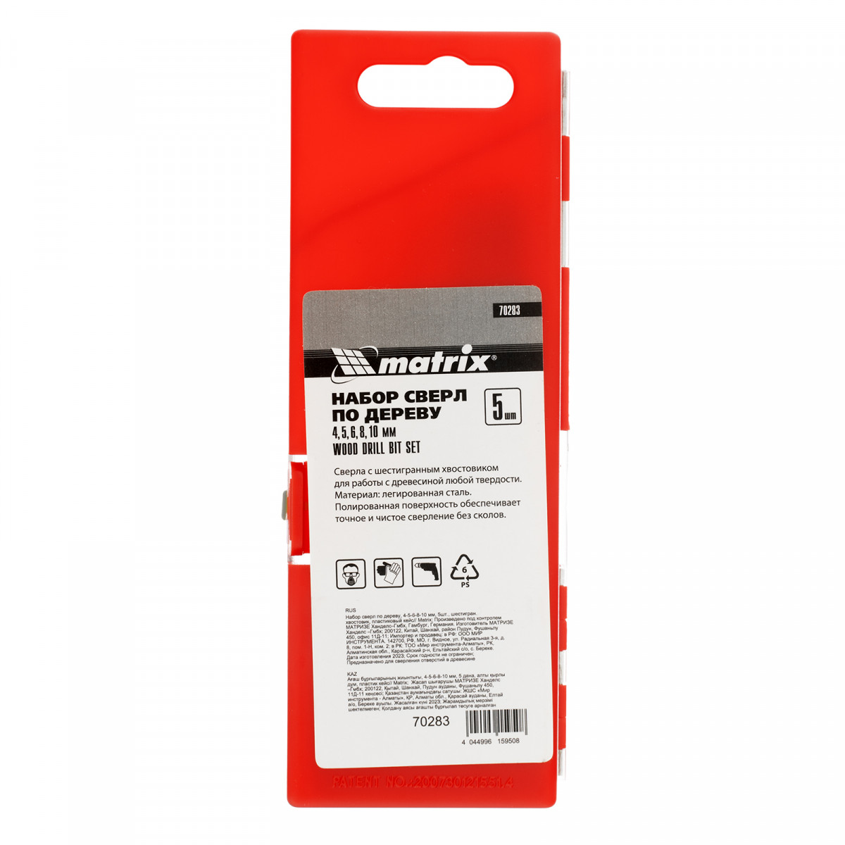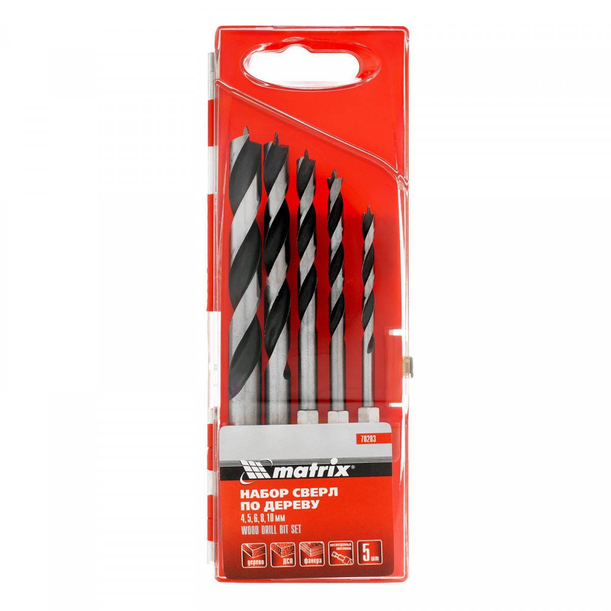 Набор сверл по дереву Matrix 70283 с шестигранным хвостовиком, 5 шт. в упаковке, позволяет получать отверстия диаметром 4-5-6-8-10 мм в древесине любой твердости. Используется во время ремонтных, отделочных и строительных работ, рассчитан на интенсивное профессиональное использование.
