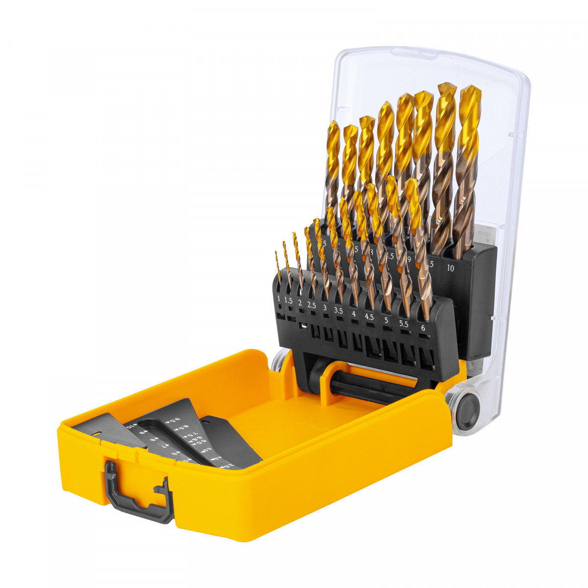 • Удобная упаковка — сверла поставляются в пластиковом кейсе с шаблоном для определения диаметра сверл.