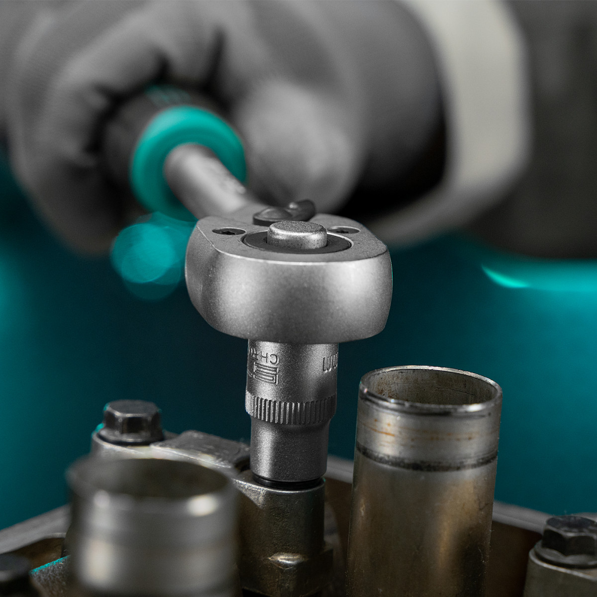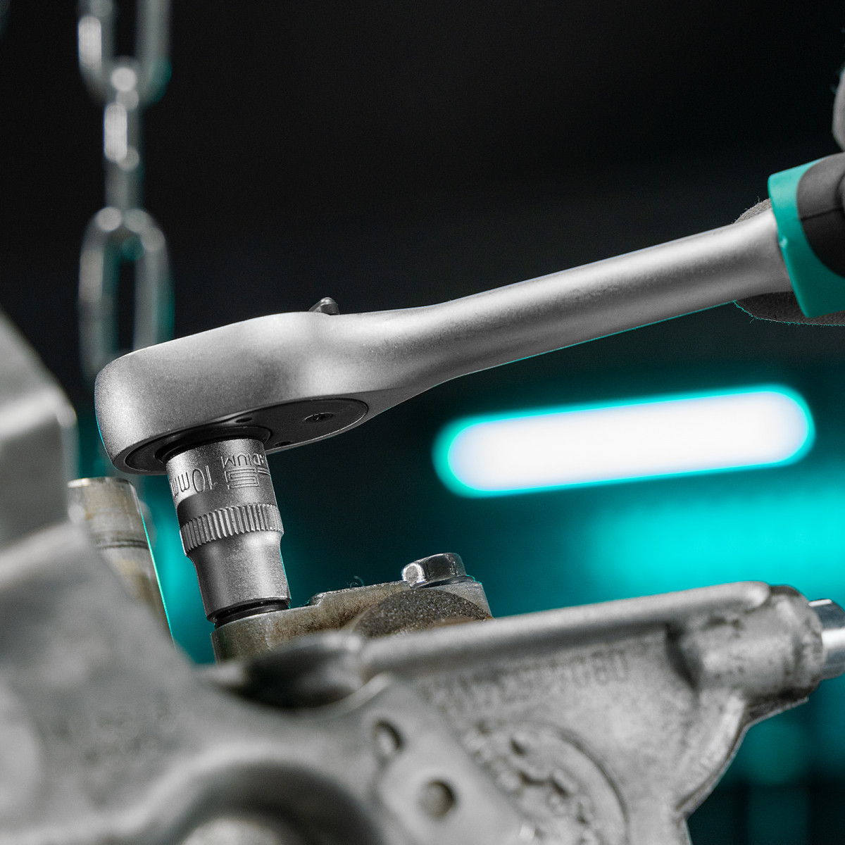 - Надежная фиксация оснастки — присоединительный квадрат трещотки оснащен шариковым держателем.