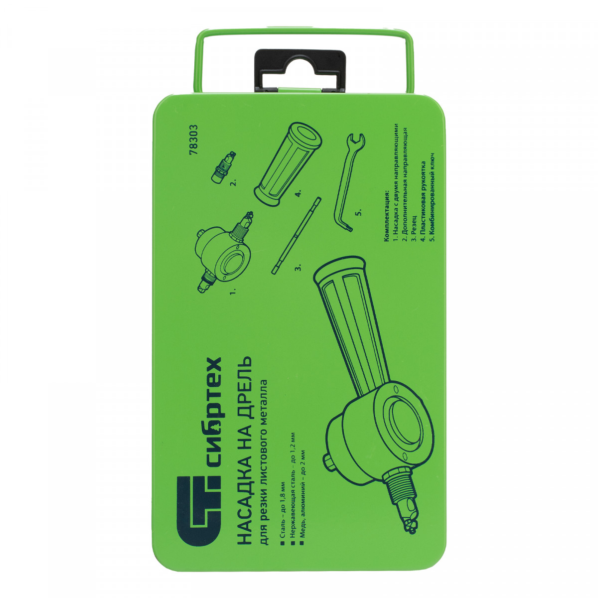 Насадка на дрель для резки листового металла Сибртех 78303 в металлическом кейсе позволяет разрезать сталь толщиной до 1,8 мм, нержавеющую сталь толщиной до 1,2 мм, медь и алюминий — до 2 мм. Ширина реза составляет 6 мм, он может быть не только прямым, но и фигурным. Приспособление устанавливается на электрические дрели со скоростью вращения 3000 об/мин. Насадка для резки металла будет полезна при проведении кровельных работ, а также пригодится в слесарной мастерской, на даче или в гараже.