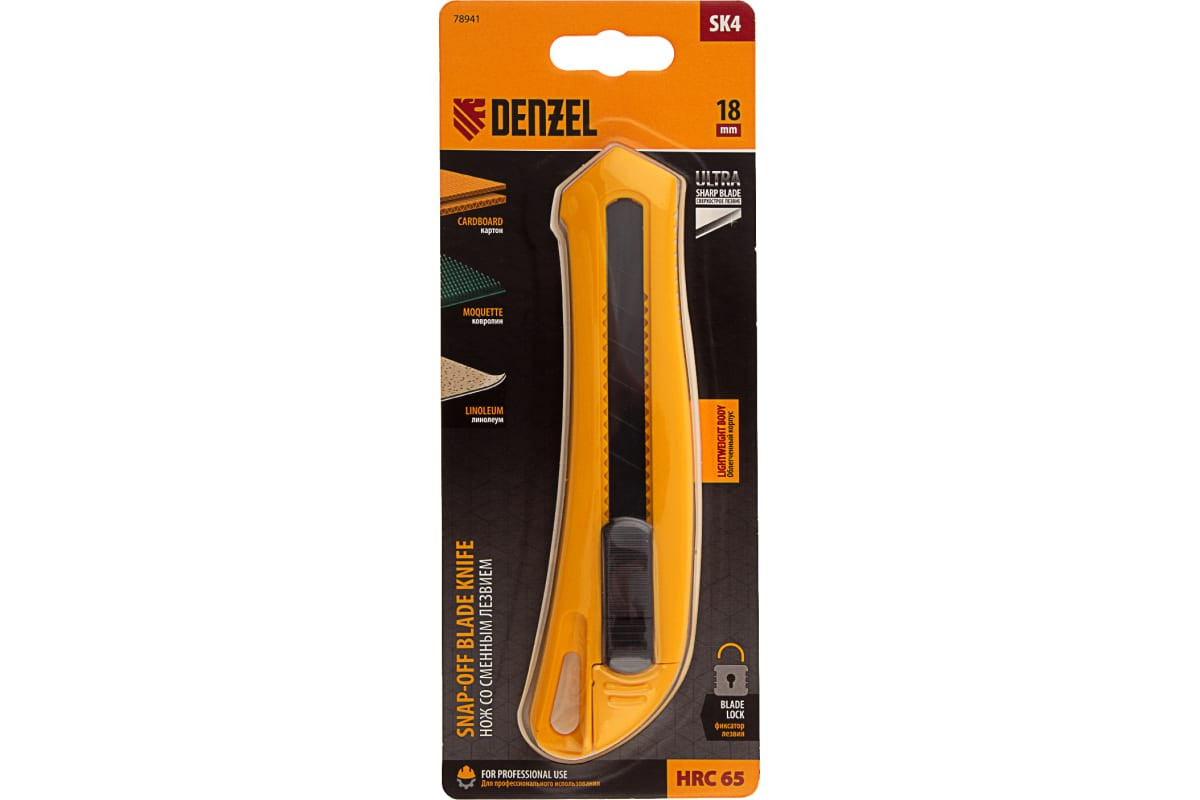 Нож 18 мм сменное лезвие SK4 облегченный корпус нажимной фиксатор Denzel