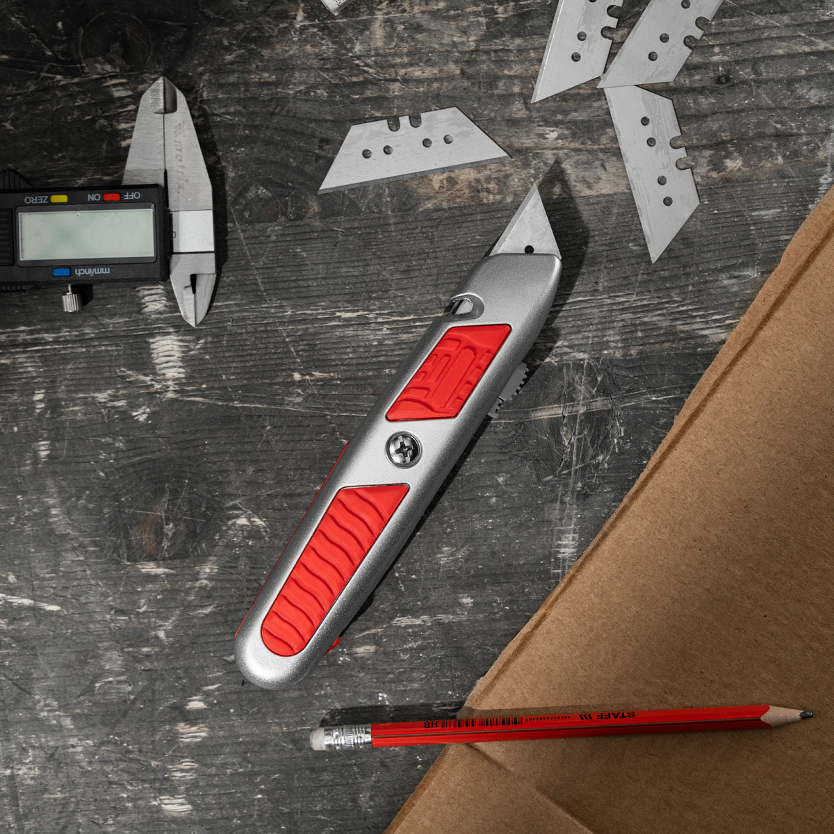 Нож Matrix 78967 с выдвижным трапециевидным лезвием и отделением для лезвий, в металлическом корпусе, режет бумагу, картон, кожу, линолеум и обои. Может применяться в качестве стропореза: для этого в корпусе предусмотрена специальная выемка. Лезвие сменное, артикул совместимых расходников 793555. Металлический корпус выдерживает значительные усилия. Нож будет полезен во время проведения строительных и отделочных работ, а также пригодится в быту.