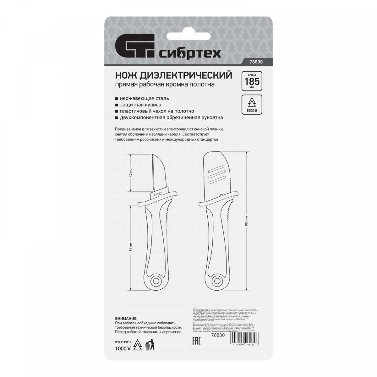 Нож диэлектрический до 1000 В, прямая рабочая кромка полотна Сибртех