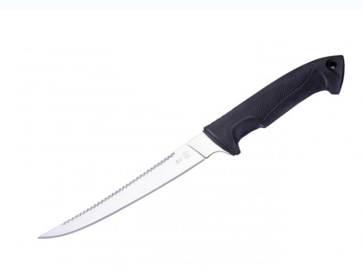 На обухе сделано агрессивное серрейторное лезвие. Оно предназначено для разрезания головы или костей рыбы. На рукояти, выполненной из пластика, установлена небольшая гарда. Она, а также текстура ручки, обеспечивают крепкий и безопасный хват. Помимо хвата, пластик не впитывает запахи, что актуально при разделки рыбы.