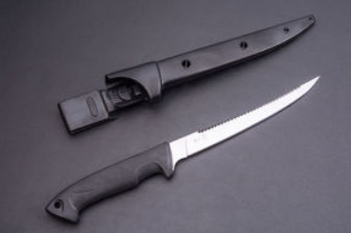 Изогнутая форма клинка с агрессивным серрейторным лезвием для эффективного разделывания рыбы.