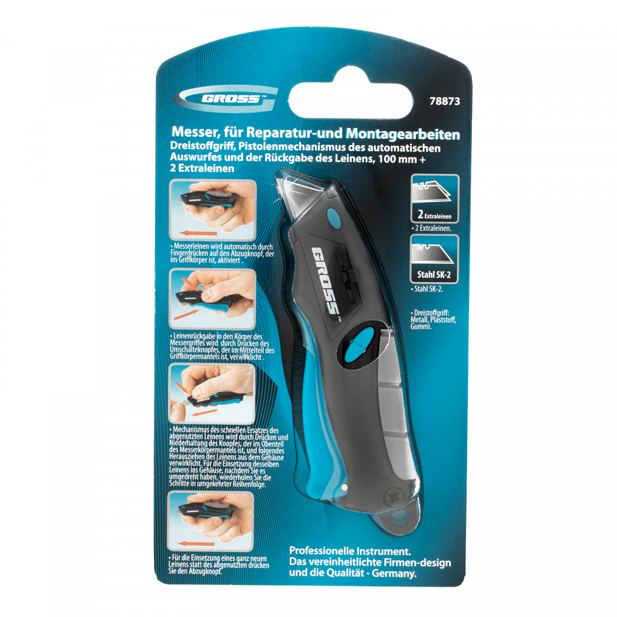 Нож ремонтно-монтажный мини, трехкомпонентная рукоятка, авто выброс, возврат лезвия, 100 мм, 2 запасных лезвия Gross