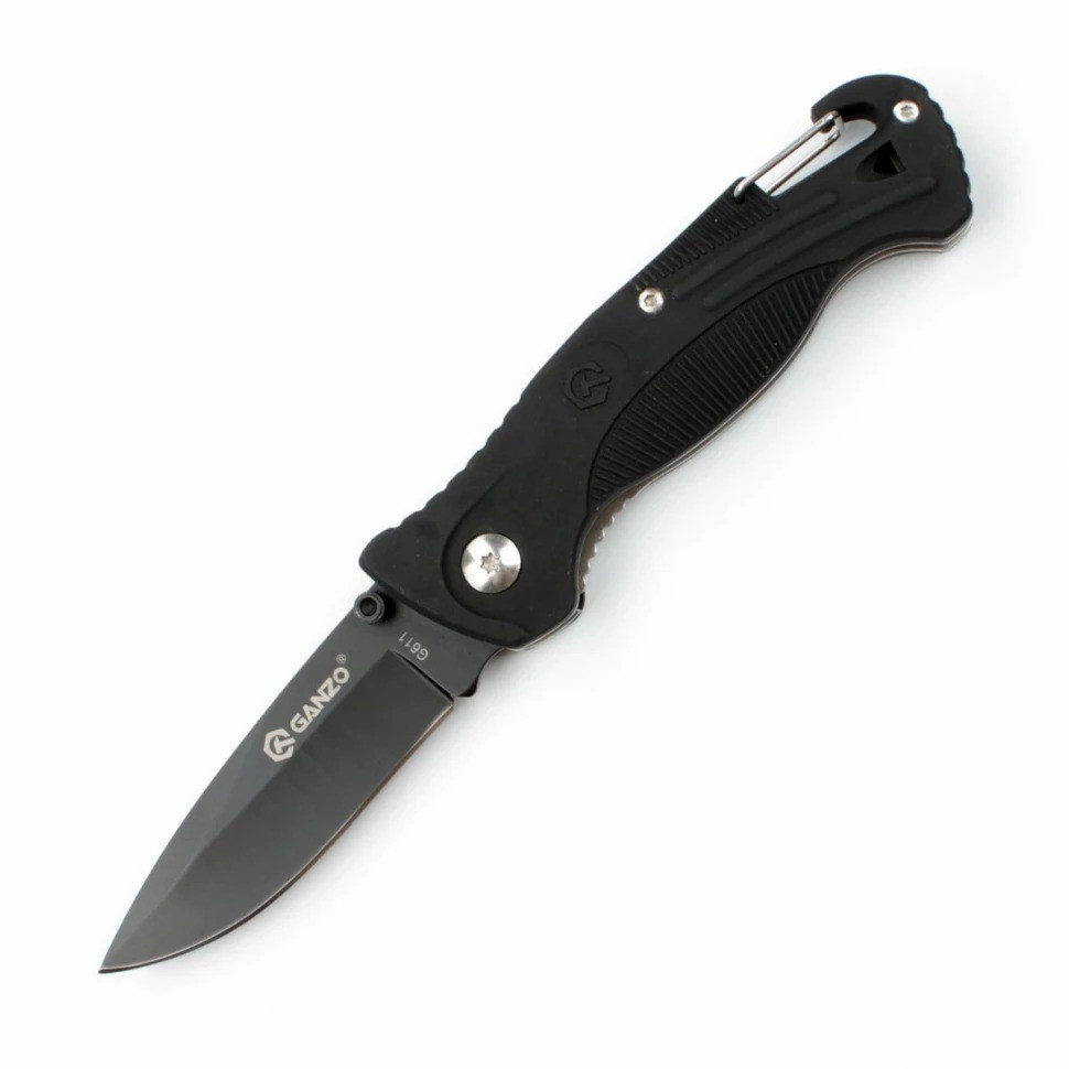 Нож складной Ganzo с зажимом и встроенным свистком, дл.клинка 75 мм, сталь 420С, цв. чёрный