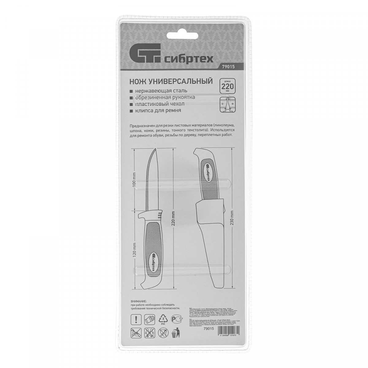 Универсальный нож Сибртех 79015 общей длиной 220 мм и длиной лезвия 100 мм, с чехлом и обрезиненной рукояткой, пригодится на стройке, при выполнении ремонтных, переплетных работ, для рукоделия. Он эффективно справляется с резкой различных материалов: линолеума, шпона, кожи, резины.