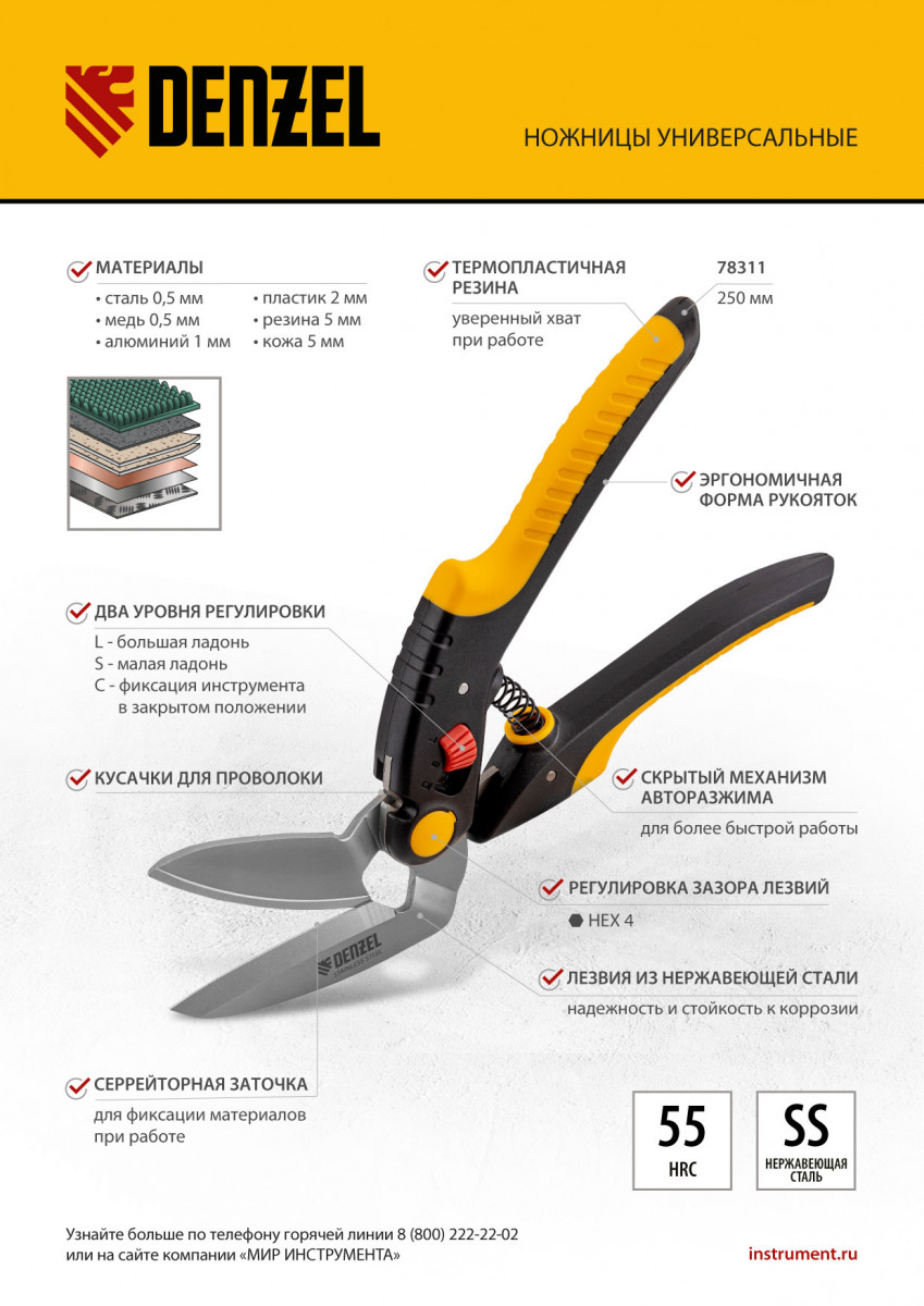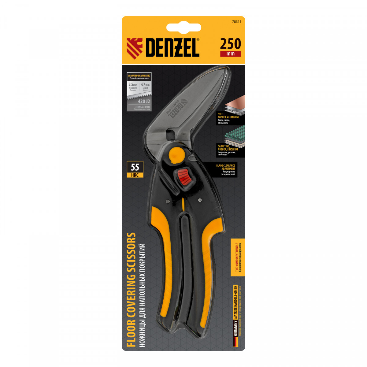 Ножницы для резки напольных покрытий Denzel 78311 длиной 250 мм, с лезвиями из нержавеющей стали и функцией перерезания проволоки/проводов, — инструмент для раскройки ковролина, линолеума, пластика, резины и других мягких материалов. Размер лезвий позволяет выполнять длинный прямой рез. Одно из лезвий имеет серрейторную (зубчатую) заточку, поэтому разрезаемый материал не выскальзывает из инструмента. Ножницы пригодятся при проведении отделочных работ.