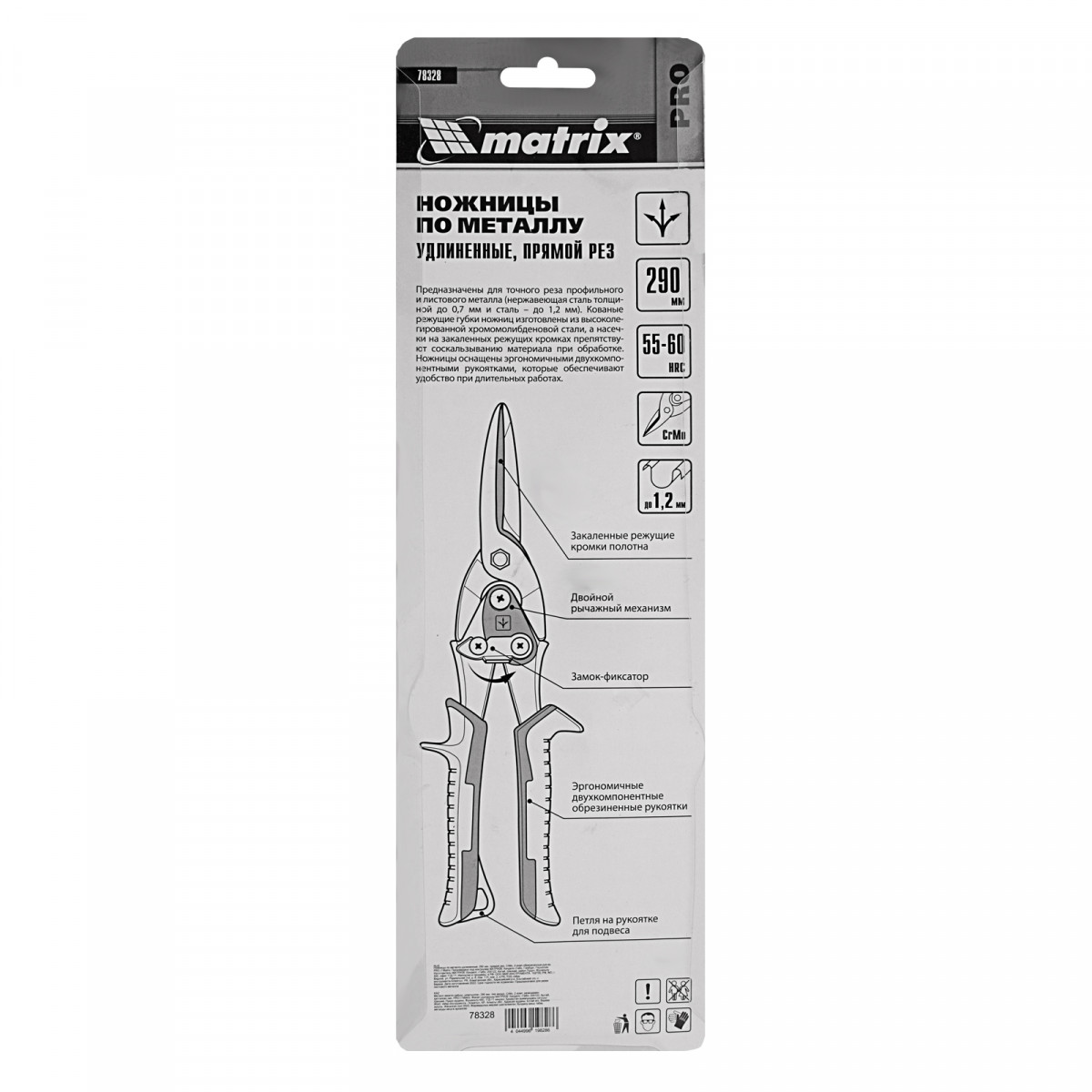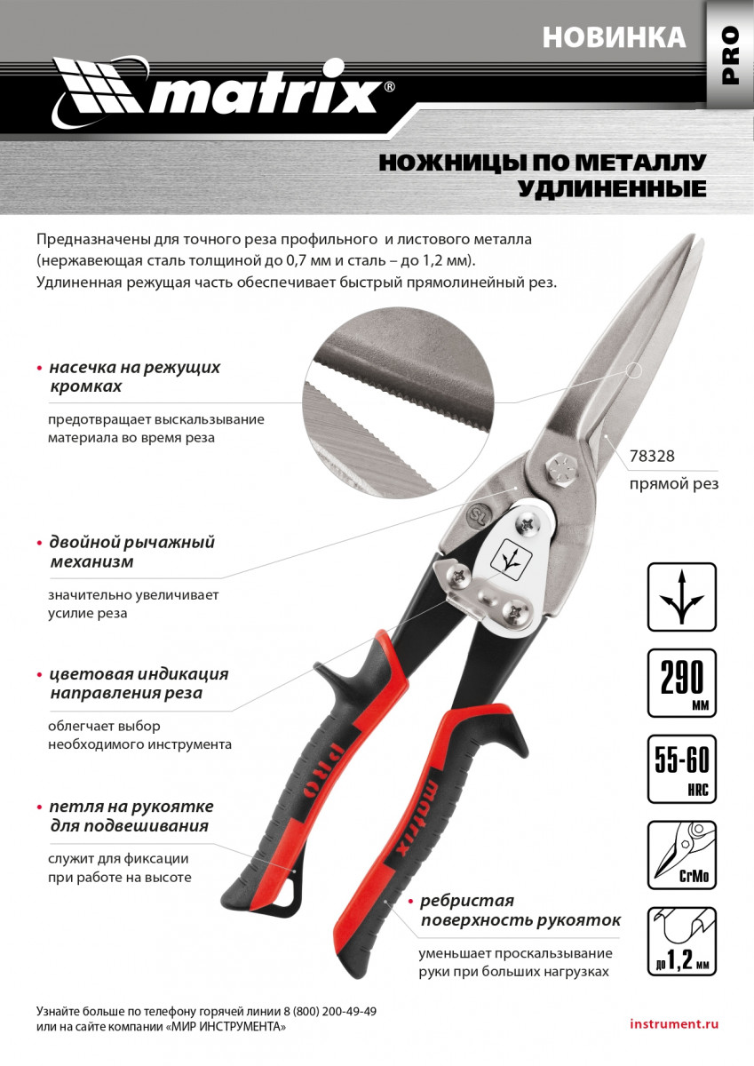 Удлиненные ножницы по металлу Matrix PRO 78328 длиной 290 мм, из стали CrMo, с двухкомпонентными обрезиненными рукоятками, предназначены для прямого реза листовых и профильных металлических заготовок, в том числе стали толщиной до 1,2 мм и «нержавейки» толщиной до 0,7 мм. Двойной рычажный механизм позволяет передавать значительное усилие, облегчая резку материала большой толщины. Для удобства работы на корпусе имеется маркировка с указанием направления резания. Ножницы будут полезны в профессиональной и домашней мастерской.