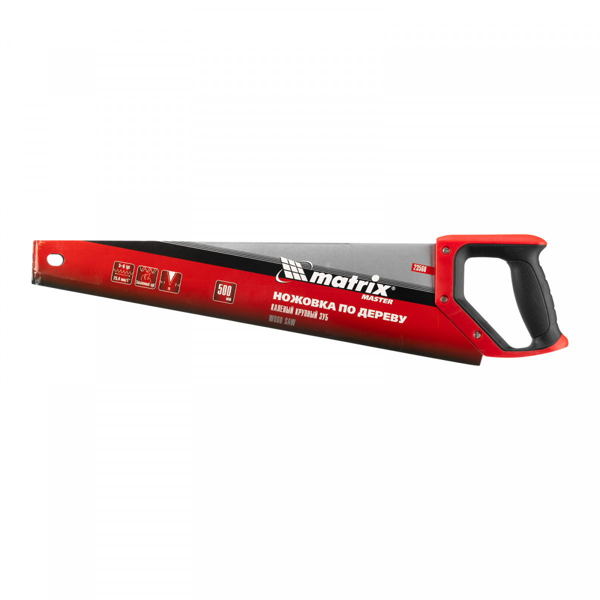 Ножовка по дереву Matrix 23560 с полотном длиной 500 мм, с крупными калеными зубьями с шагом 5-6 TPI, волновой вырубкой и 2D-заточкой, с двухкомпонентной рукояткой, используется для быстрой продольной или поперечной распиловки древесины. Высокая скорость работы достигается благодаря крупным зубьям с волновой заточкой и универсальным шагом 4-5 мм. Двухгранная заточка зубьев дает возможность пилить в направлении как от себя, так и на себя, а также перетачивать режущую кромку при необходимости. Ножовка подходит для выполнения плотницких и хозяйственных работ.