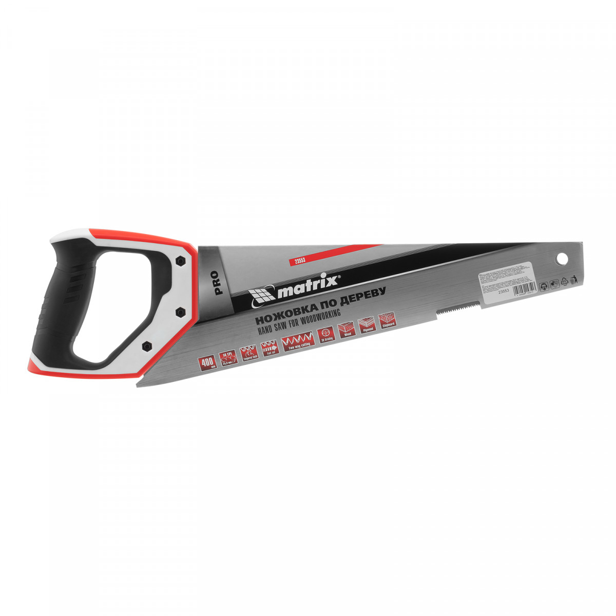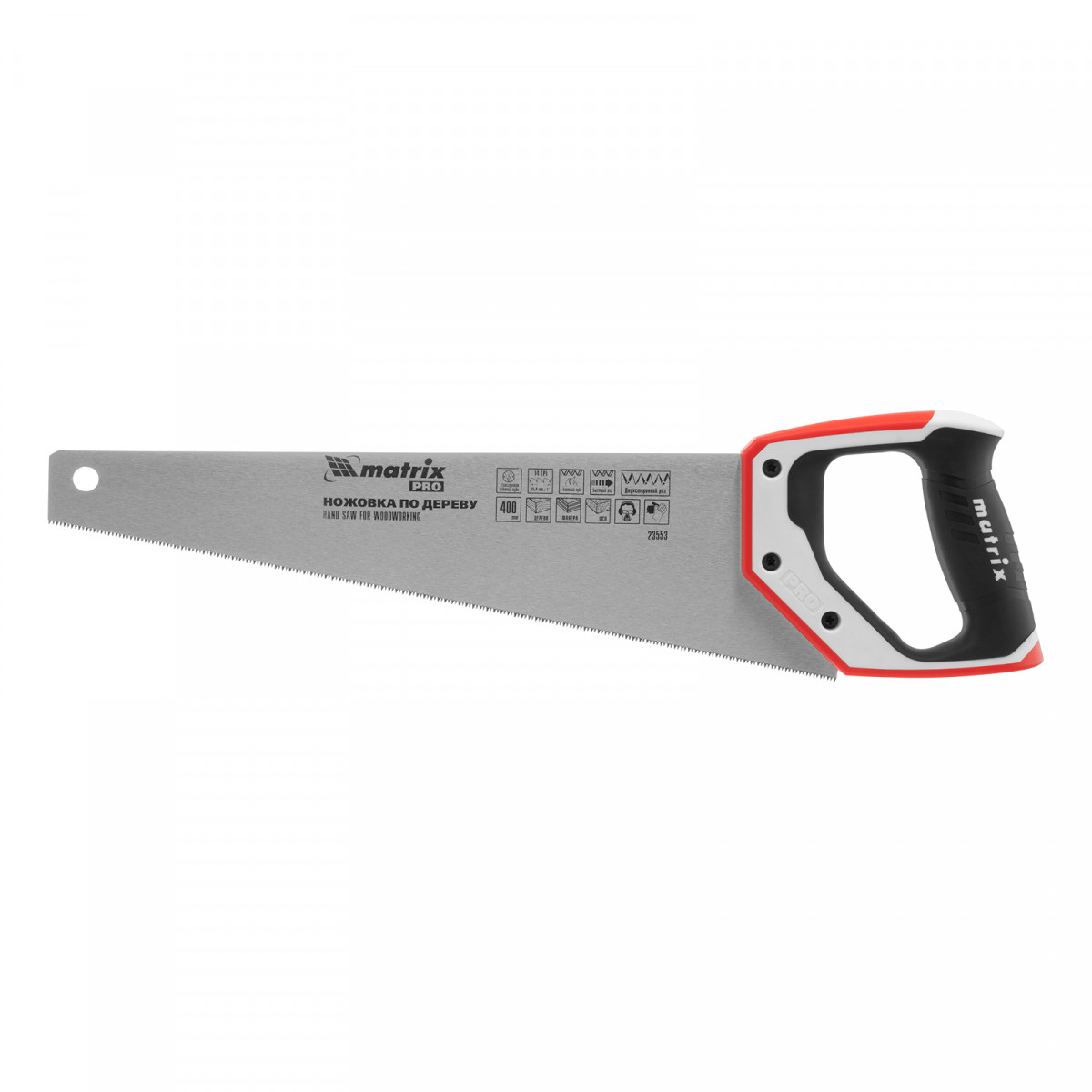 Ножовка по дереву Matrix PRO 23553 с полотном длиной 400 мм, калеными зубьями с шагом 14 TPI и 3D-заточкой, с трехкомпонентной рукояткой, предназначена для точных пильных работ с заготовками из древесины, фанеры и ДСП. Подходит для продольного и поперечного пиления. Шаг зубьев составляет 14 TPI, что обеспечивает точность реза. 3D-заточка зубьев увеличивает производительность ножовки. Инструмент будет полезен в столярной мастерской, а также пригодится в быту.